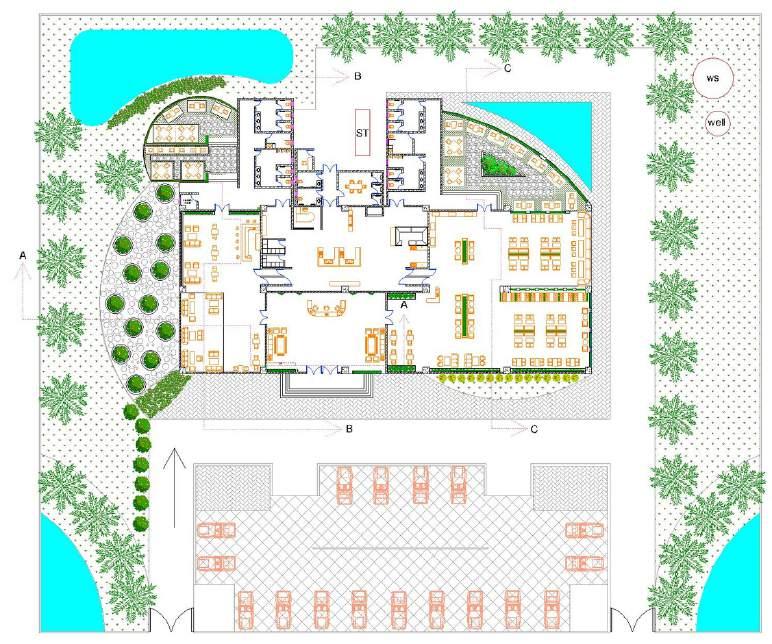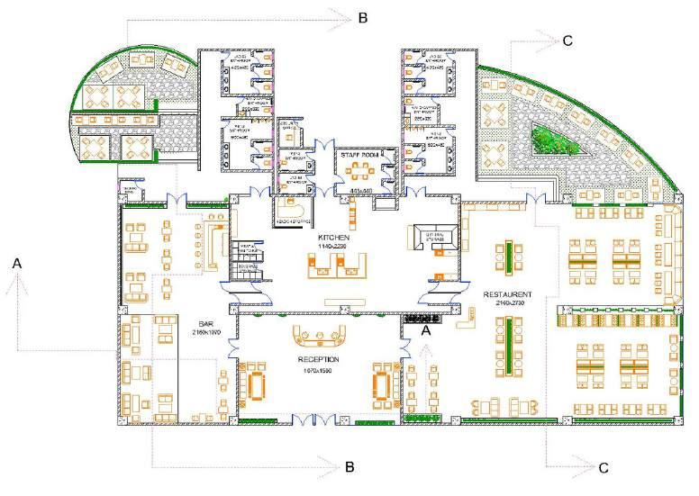 This hotel ground plan features a restaurant with live music and outdoor seating, as well as a nearby swimming pool. Enjoy the sun while ordering food and drinks. A bar near the restaurant and kitchen provides guests with additional dining options.