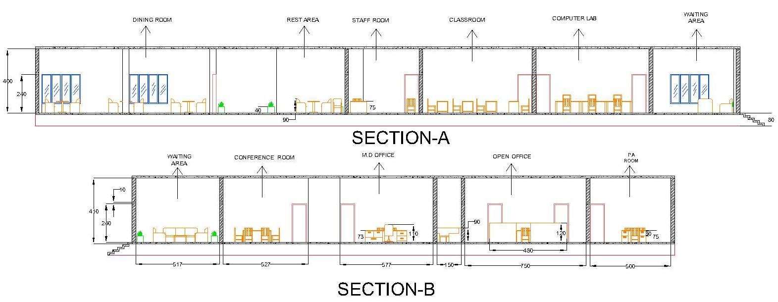 The training center consists of a computer room, a small classroom, and a staff room. Both sections have a common dining area and separate bathrooms for gents and ladies.