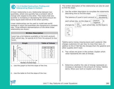 each school day, so the slope is o positive. It o negative. changes by o $40 each school day, so the slope is o $2.50