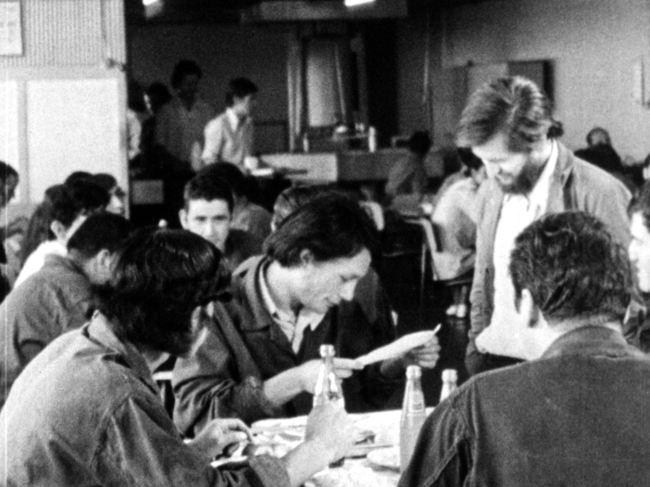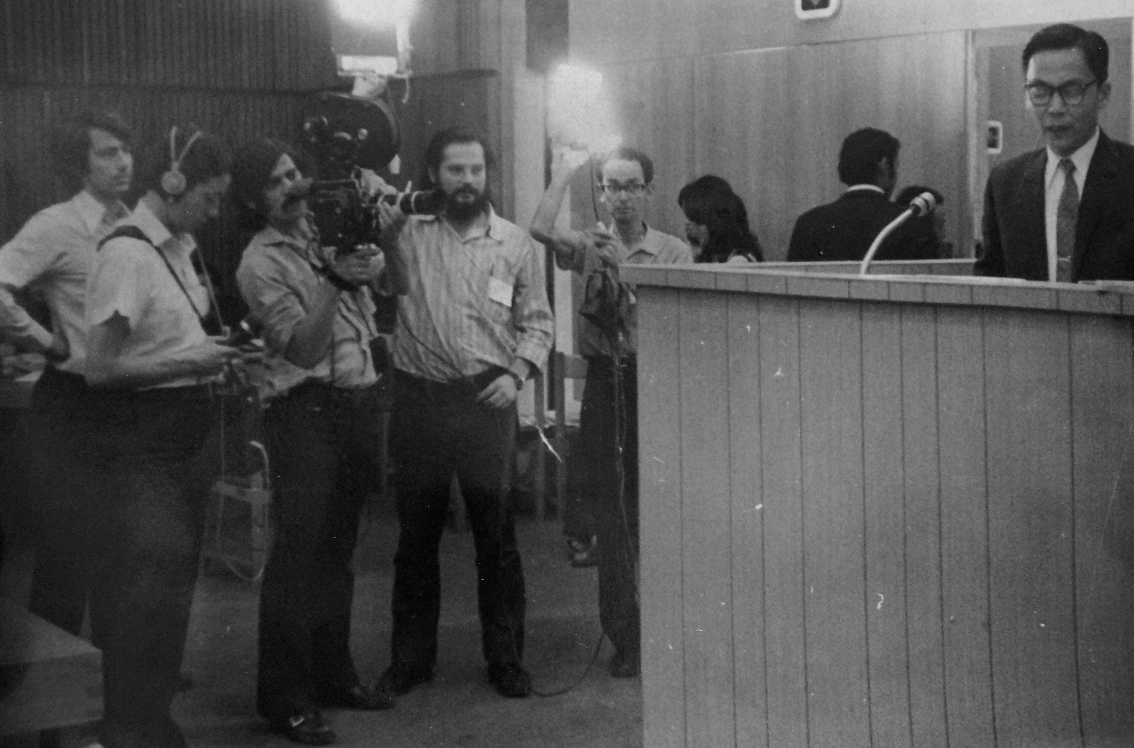 A equipe do Departamento de Cinema da CUT filmando Assembleia Sindical Mundial em 1973.