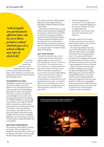 THE BENEFITS OF LEDS LED lighting has replaced a lot of kerosene lamps on the continent. As they have elsewhere in the world, LEDs have become a great competitor of conventional lighting technologies. The LED is a semiconductor based on the p-n junction of a diode that emits visible light of a certain colour when electricity passes through it. It has a long life, from 25,000 to 50,000 hours, and also a high luminous efficacy which ranges from 60-130 lm/W. It is therefore very useful in batterypowered systems, and continuously improving. Their efficiency reduces the operational cost compared to other light sources, and they produce higher luminous flux in smaller packages which is favourable in most lighting applications. There has also been a price drop in the LED industry, making it affordable to the rural population.