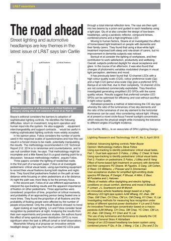 through a total internal reflection lens. The rays are then split into two beams by a prism and guided to each headlamp using a light pipe. Qiu et al also consider the design of low-beam headlamps, using a parabolic reflector, compound lenses, combined prisms and a high-brightness LED. Moving to human factors, Sloane et al investigated the effect of home-based light treatment on people with dementia and their family carers. They found that using a blue-white light treatment improved both sleep and role-strain of carers, but no improvement in dementia subjects was noticed. Borisuit et al consider the lighting of workplaces, and their contribution to work satisfaction, productivity and wellbeing. Overall, subjects preferred daylight for visual acceptance and glare. In the course of an afternoon, it was also found that changes of photometric variables modulated changes in visual light perception, alertness and mood. It has previously been found that 12-channel LEDs with a high colour quality scale (CQS), colour preference scale (Qp) and a high CQS gamut area scale (Qg) give a preferred SPD. Baniya et al note that, due to their complexity, 12-channel LEDs are not considered commercially exploitable. They therefore investigated generating simplified LED SPDs with the same quality values. Results suggest that preferred complex LED SPDs can be optimised for efficiency and cost without sacrifice in light colour quality. Alshaibani presents a method of determining the CIE sky type whereby the ratio of the luminances of two sky elements and the ratio of the luminance of one sky element to the horizontal illuminance can be used. Also considering natural light, Whang et al present a novel circle-focus Fresnel sunlight concentrator, which reduces the physical weight while increasing the tolerance to different angles of sunlight incidence. Iain Carlile, MSLL, is an associate of DPA Lighting Design Lighting Research and Technology Vol 47, No 2, April 2015 Editorial: Advancing lighting controls Peter Boyce Opinion: Methodology matters Steve Fotios Using eye-tracking to identify pedestrians’ critical visual tasks, Part 1. Dual task approach S Fotios, J Uttley, C Cheal, N Hara Using eye-tracking to identify pedestrians’ critical visual tasks. Part 2. Fixation on pedestrians S Fotios, J Uttley and B Yang Effect of home-based light treatment on persons with dementia and their caregivers PD Sloane, M Figueiro, S Garg, LW Cohen, D Reed, CS Williams, J Preisser and S Zimmerman User-acceptance studies for simplified light-emitting diode spectra RR Baniya, R Dangol, P Bhusal, A Wilm, E Baur, M Puolakka and L Halonen Effects of realistic office daylighting and electric lighting conditions on visual comfort, alertness and mood A Borisuit, F Linhart, J-L Scartezzini and M Münch An innovative vehicle headlamp design based on a highefficiency LED light pipe system AJW Whang, KC Jhan, SM Chao, GW Chen, CH Chou, CM Lin, CM Chang, KY Chen, YL Lai Investigating methods for measuring face recognition under lamps of different spectral power distribution Y Lin and S Fotios An innovative Fresnel-type concentrator based on a macroparabola AJW Whang, CH Chou, SM Chao, YC Chen, CM Lin, KC Jhan, CM Chang, KY Chen and YL Lai The use of sky luminance and illuminance to classify the CIE Standard General Skies K Alshaibani Design of an LED-based headlamp low-beam system using combined prisms P Qiu, A Ge, J Wang, J Cai, L Zhu and Z Du