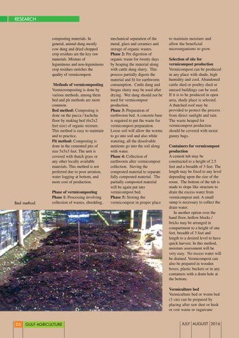 composting materials. In general, animal dung mostly cow dung and dried chopped crop residues are the key raw materials. Mixture of leguminous and non-leguminous crop residues enriches the quality of vermicompost. Methods of vermicomposting Vermicromposting is done by various methods, among them bed and pit methods are more common. Bed method: Composting is done on the pucca / kachcha floor by making bed (6x2x2 feet size) of organic mixture. This method is easy to maintain and to practice. Pit method: Composting is done in the cemented pits of size 5x5x3 feet. The unit is covered with thatch grass or any other locally available materials. This method is not preferred due to poor aeration, water logging at bottom, and more cost of production.