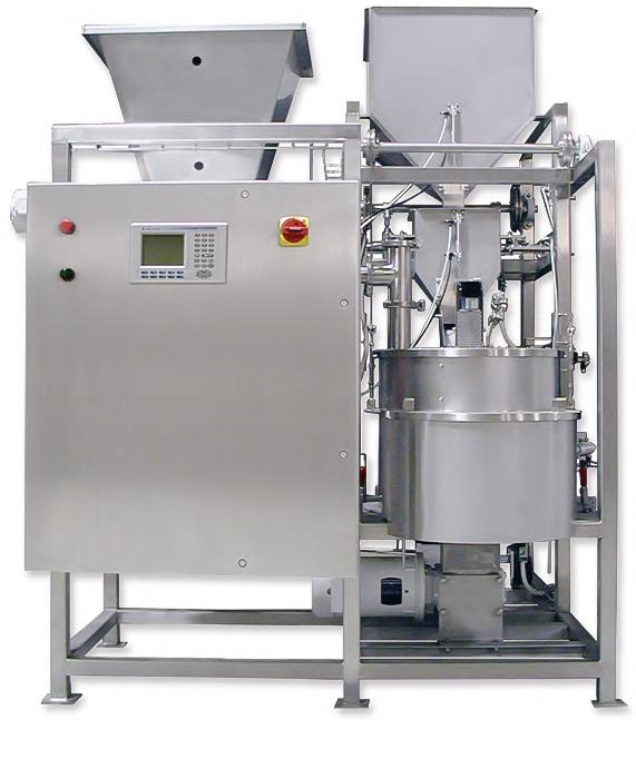slide gate) delivers the product to a PLC controlled weigh scale. Accurately measured batches of base product are then fed to a coating chamber. Rotation carries the base product out to the coating chamber wall and solution is introduced to a high-speed spinning disc liquid applicator via a positive displacement pump — at which point powders are then delivered in alternating cycles via a Uni-Spense® Dry Ingredient Distributor.