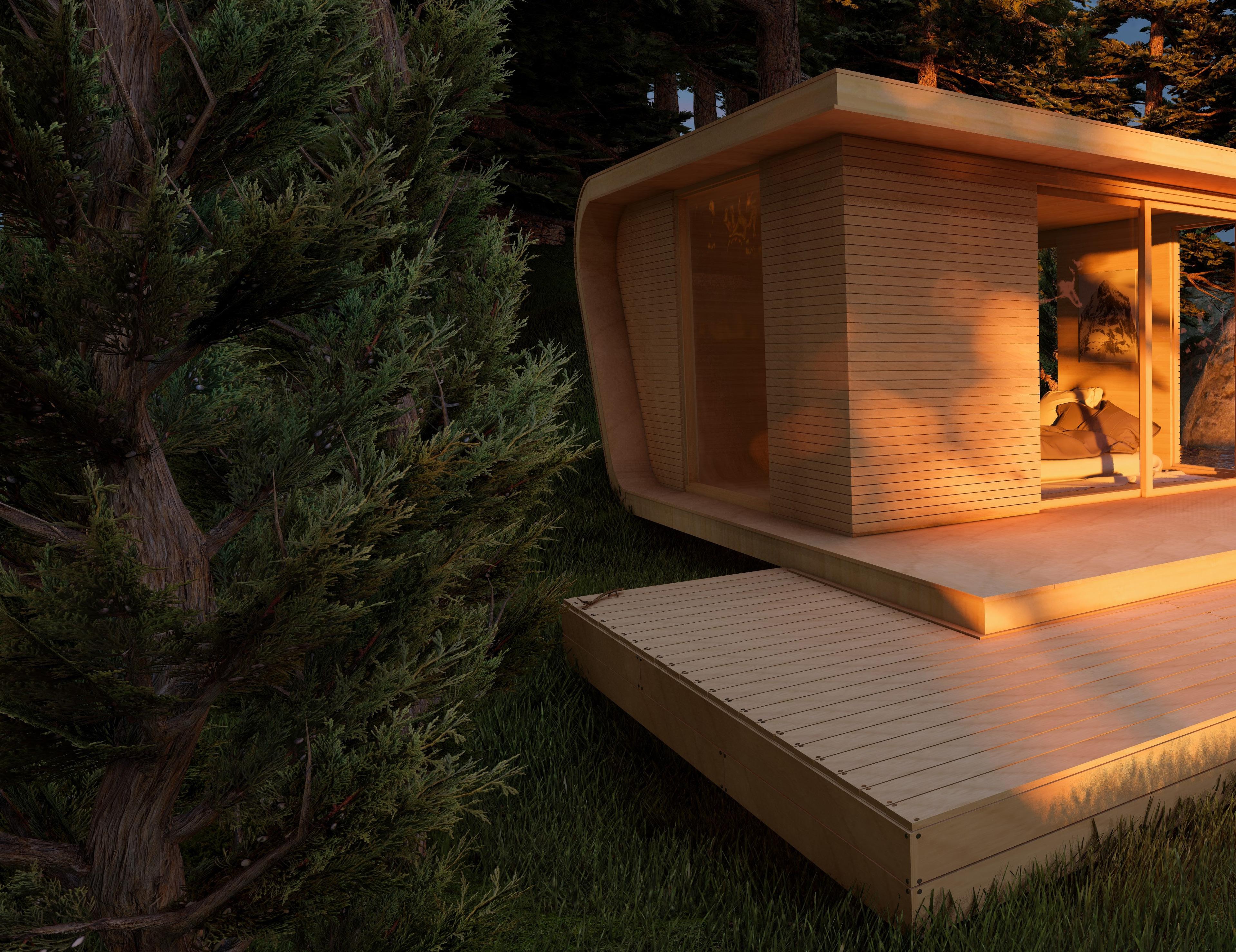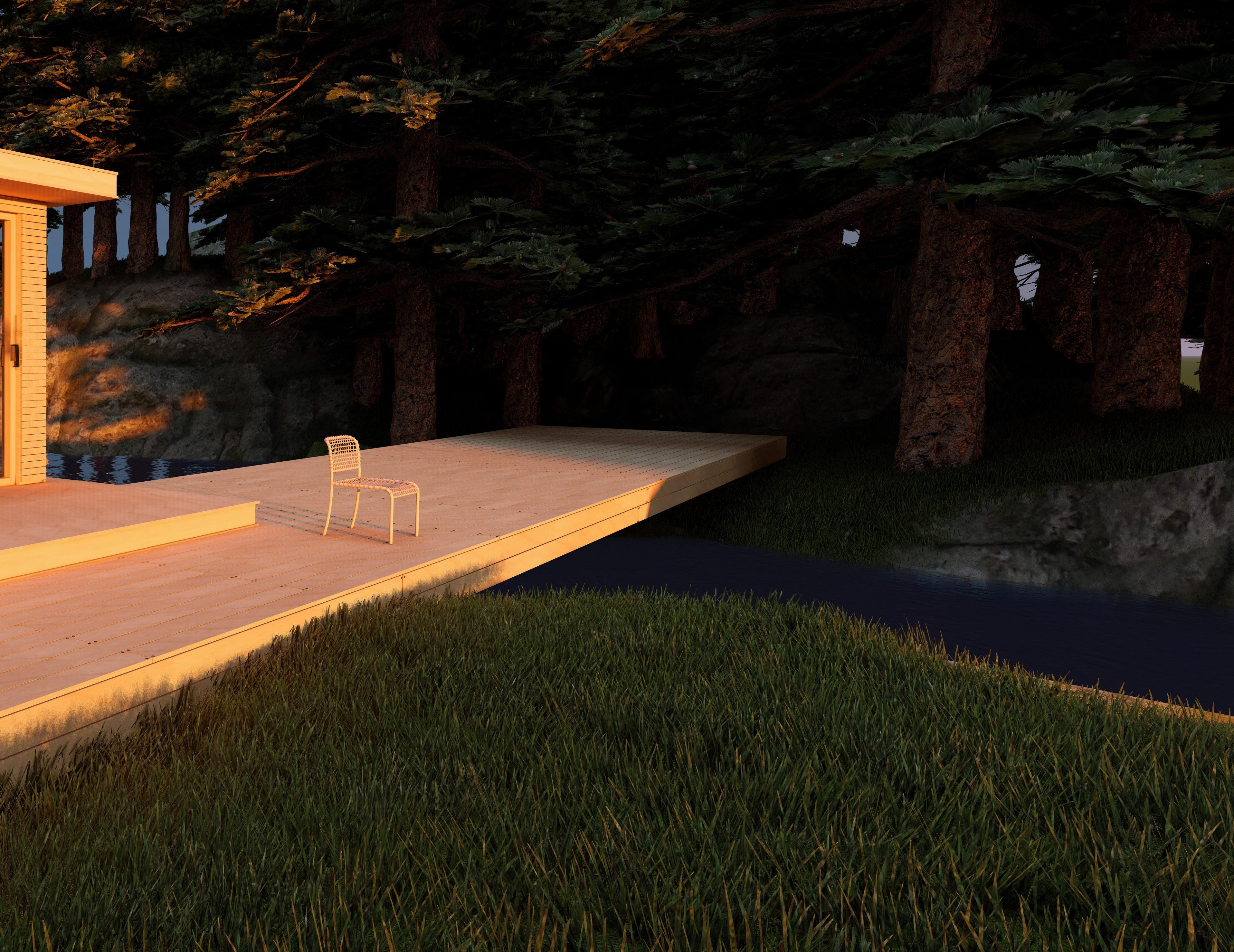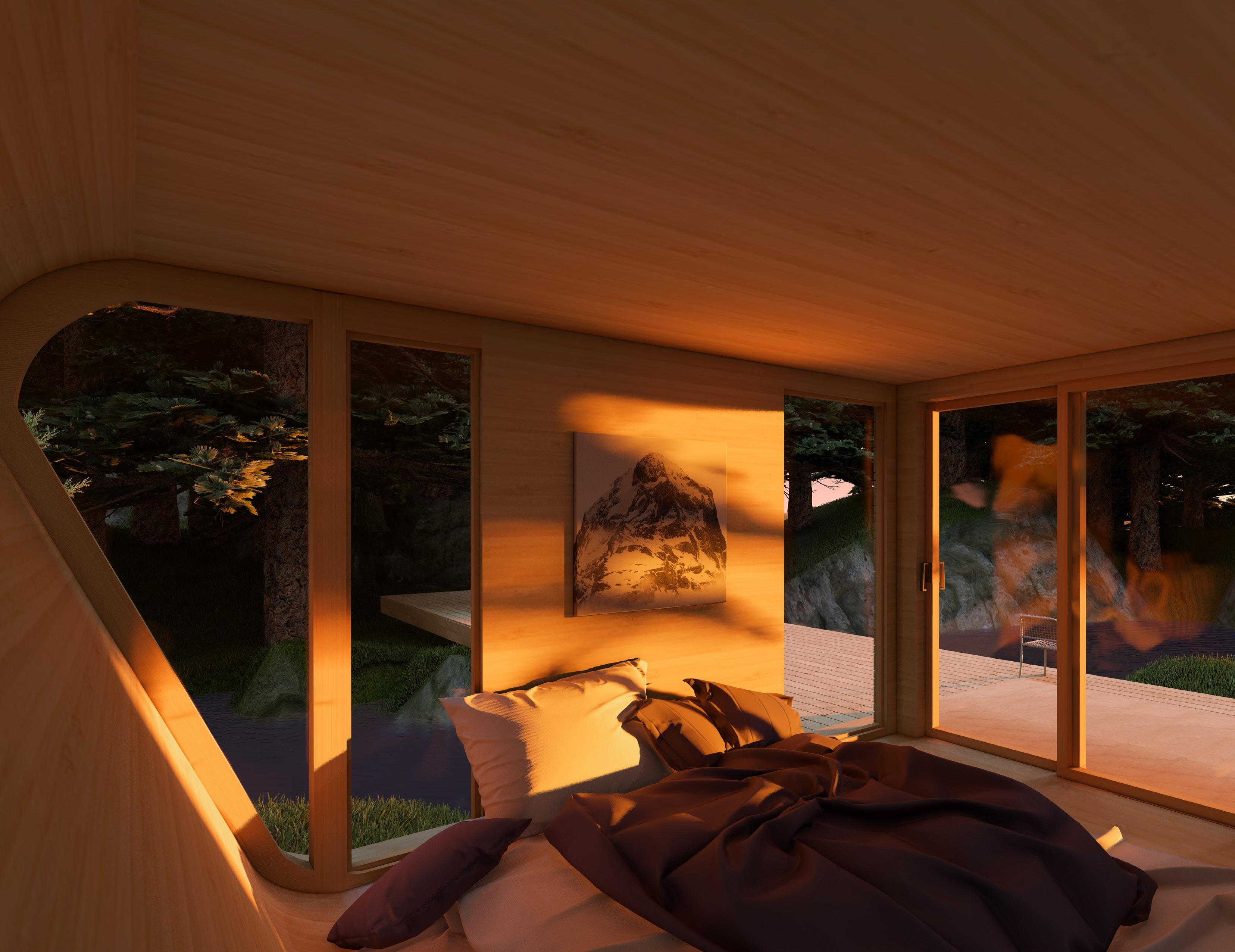 Both Renders are taken at 7 AM, as to show the natural filter sunlight through the trees of Ricketts Glen State Park, and to emphasize the beauty of the wooden materiality of this cabin.