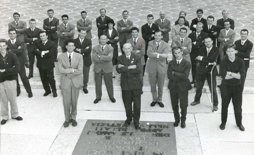 Festival di Trento (1966?). Da sin. 1afila, Claude Barbier, Gaston Rébuffat, x, Marino Stenico, Michel Vaucher; 2a fila, Cesare Maestri, Georges Livanos, x, Riccardo Cassin, Walter Bonatti, Toni Hiebeler, Bepi De Francesh, Pierre Mazeaud; 3a fila: Gigi Alippi, x, Romano Perego, Roberto Sorgato, Luigino Airoldi, x, Yvette Attinger Vaucher, x, x, x, x (che nasconde una donna), x, x, x, x; 4a fila: donna, x, John Harlin.
