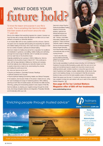 See page 23 for her Limited Matters Magazine offer of $50 off her treatments. www.avalonhealing.com.au