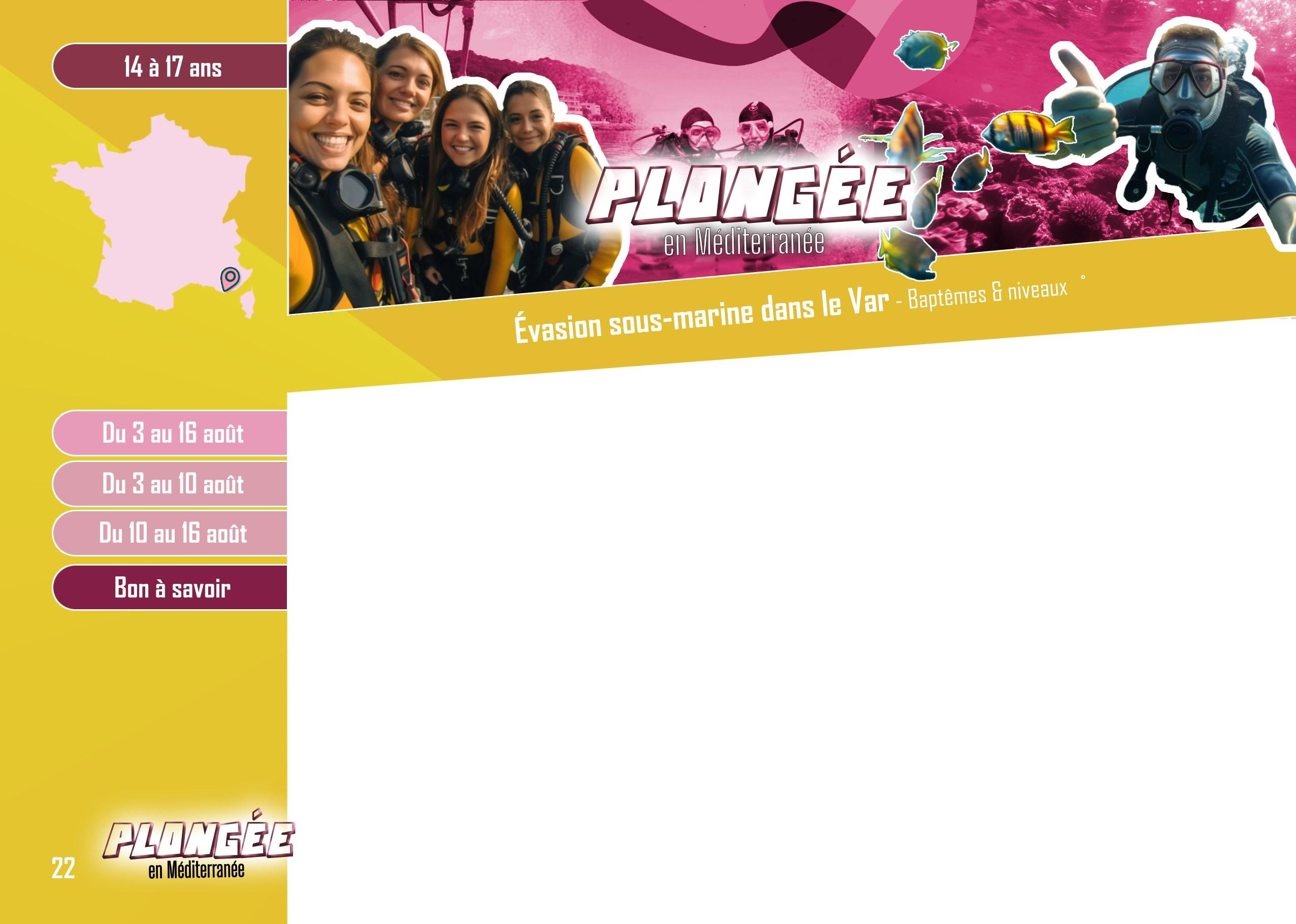3 au 16 août 881 € + licence FFESSM obligatoire, - 16 ans : 65.7 € + 16 ans : 87.8 €