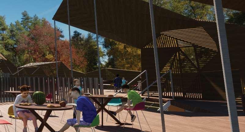 By implementing organic design, natural light seepsintotheinteriorspacesdifferentlythroughout theday,replicatingthefeelingofbeinginaforest. An accessible open roof allows the children and staff members to enjoy the view of the lake that runsthroughFoxesForest,trulyformingaone-ofa-kindlearningenvironment.