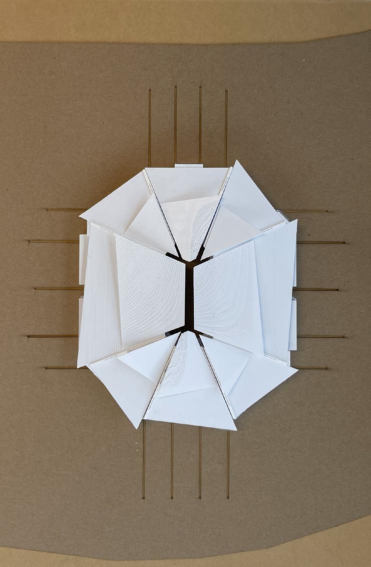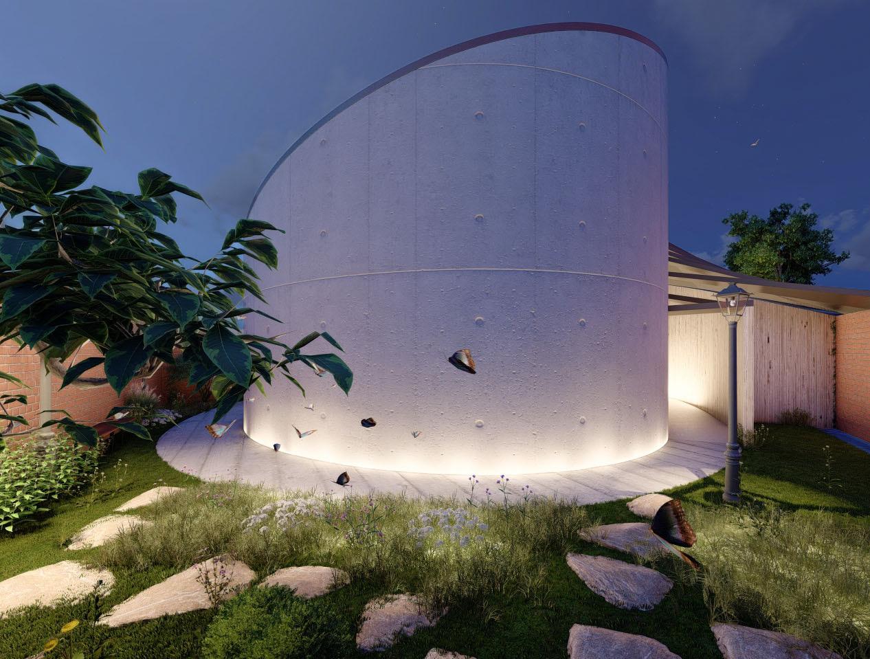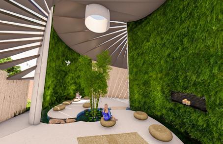 Brick walls separate the meditation space from the surrounding profane world. Inside the brick walls the meditator descends into the rectilinear exterior walls and curved interior walls that compress the pathway before it opens into an exterior courtyard filled with nature to invoke the feeling of peace and calming. The meditator then ascends into the interior space following the water from outside in. Inside the meditation space, nature dominates the space with two curved green walls and a central bamboo tree which sits directly below an oculus, drawing attention to the verticality of the space and connecting it to the sky. The finned roof offers dynamic lighting effects that change throughout the day. The natural and artificial light are used in tandem with nature in order to create filtered lighting effects that are prone to change with time. After meditation and contemplation are complete the elevated mind descends out to a less provoking exterior courtyard and path that realign them with the surrounding world. It only takes a small space to transcend reality.