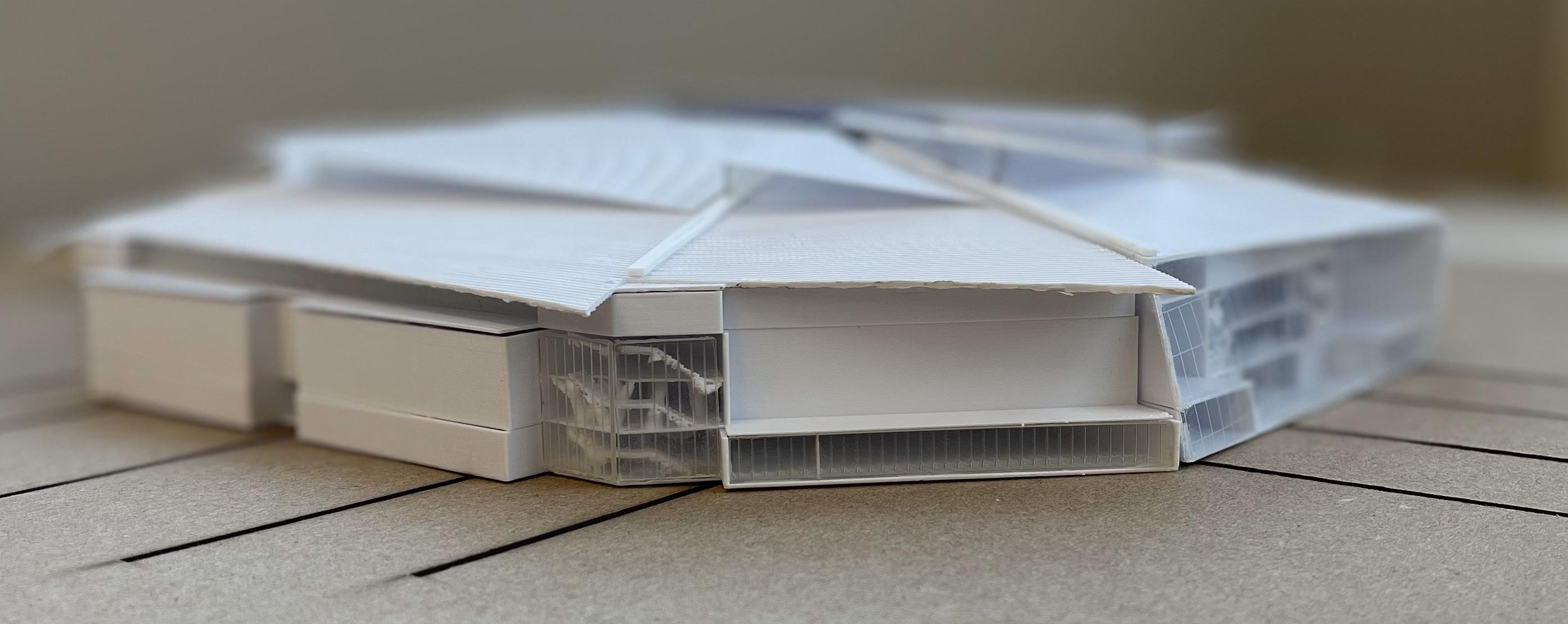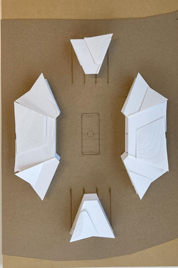 In this studio I was open to research and create something based on my interests. My main interest at the time was sports facilities, specifically stadiums. I wanted to focus my attention on how these facilities could use the implementation of kinetic (moving) parts in order to facilitate their use for all sports and uses, not just one specific one. I wanted to apply this movement at multiple scales, from the removability of playing surfaces like field turf, to kinetic roof features allowing the building to be open air or enclosed. This would allow for the stadium to be more useful throughout its lifespan, rather than being vacant for much of the time. - 1/64” = 1’0”