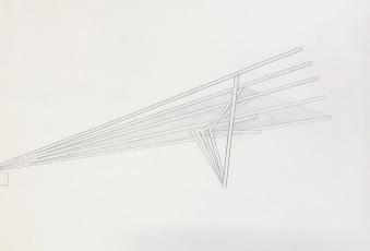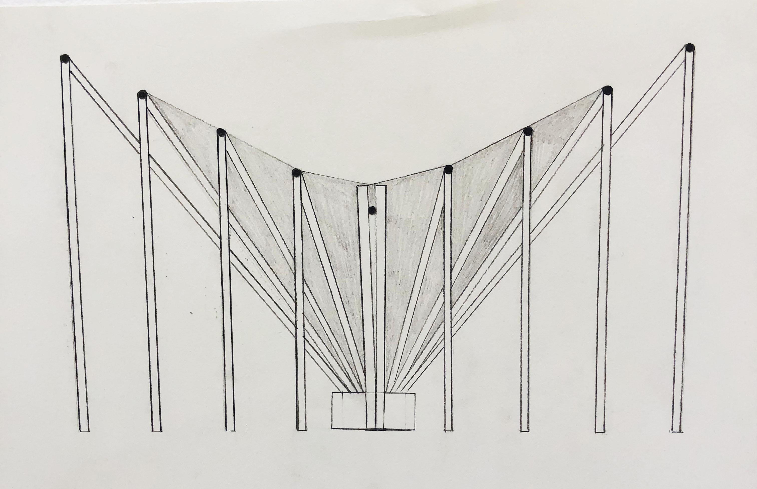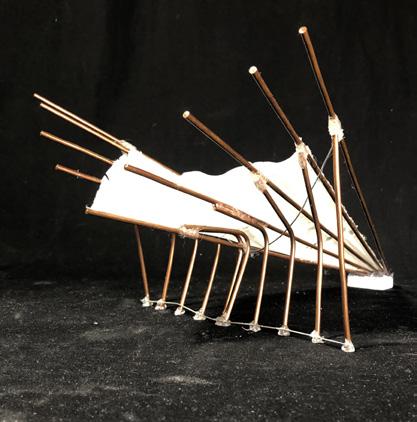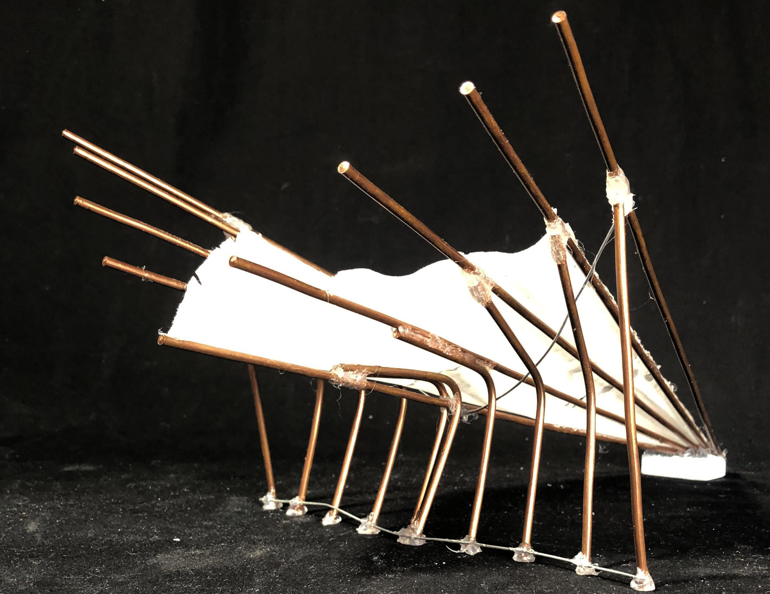 Rhythm and repetition are the main ordering principles seen throughout the model. Rhythm is shown in the model through the changing arm angles as the model moves down toward the axis and back up toward the edges. The wires and angles are not the exact same shape but have a rhythm through the piece. Repetition is shown in the wires that make up the top of the piece. These wires are fanned out from the vertex at the back, but are all the exact same length and size, as well as set one inch apart from each other. The same wire is repeated 9 times in the piece just at a different angle with the grounded plane.