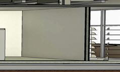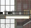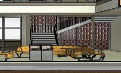 The main entrance is located on the Southwest corner of the building and opens directly to the main lobby space. From the lobby there are views of the circulation paths that lead down to the bookstacks or up to the mezzanine. The structure of the mezzanine is similar to the existing structure of the building, a combination of steel and concrete allowing the new addition some sort of unity with the old materials. The edge of the mezzanine is a concrete half wall that rises about 4ft and is continuous throughout the mezzanine allowing views over but still separating and keeping a more privatized space. The ground floor is about bookstacks and building function(containing books, computers, restrooms and mechanical spaces) the upper level is about private studies, reading, and group discussion. Light enters the space mostly from the lobby and from above through clerestory windows. This allows books to stay protected from damage but keep adequate lighting conditions.