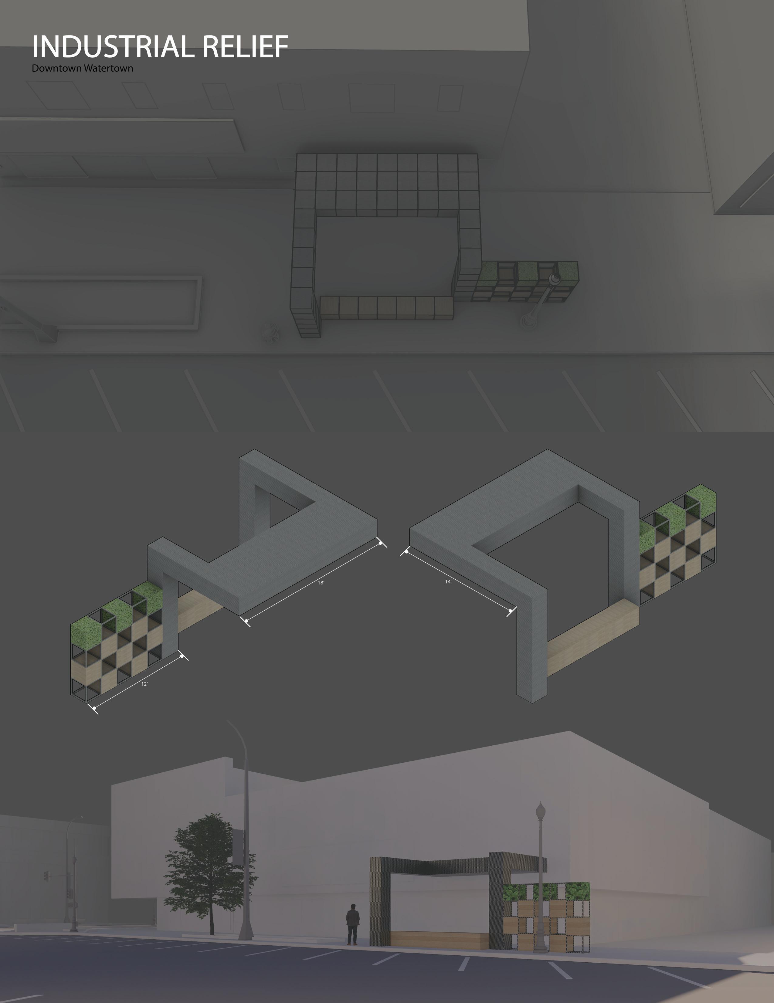 The goals for this project were to start to understand the complexities of what makes a downtown environment “good” and how they can be more walkable and appealing to the public. I discovered that buildings aren’t the only thing that matters. Much of what makes a downtown walkable and appealing can be done with sculptural instillations. Using a combination of dynamic sculptors that enhance and inform views to the downtown as well as buildings that speak the same language allows for pedestrians to feel safer, and connected to the city they are walking through. Through the use of rendering tools and site research I was able to develop installations and buildings that create a more interesting and dynamic relationship in downtown Watertown, not only enhancing the walkability of the city, but also relating the viewers experience to the landmarks and important historical features of the area.