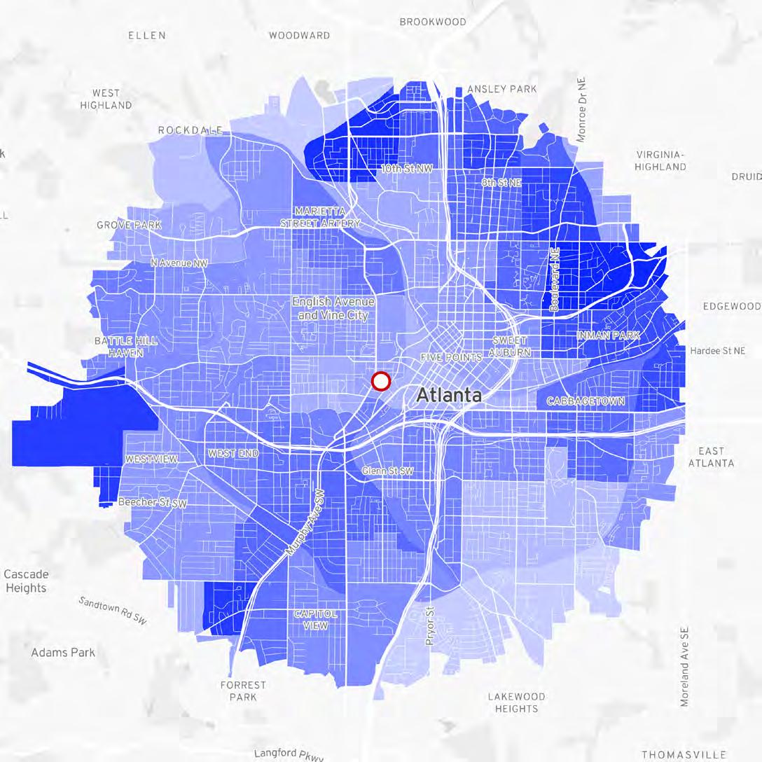 These three maps measure affordability metrics for Atlanta as a whole. Towards the Northeast, housing and transportation takes up a considerable portion of residents’ income, peaking at 71%. This means that a resident making $50,000 annually would only have $14,500 remaining after the necessary cost of living and working. For those that don’t own a personal vehicle, public transit costs come in at about $200 annually for Southeast and Central Atlanta, peaking at $600 elsewhere.