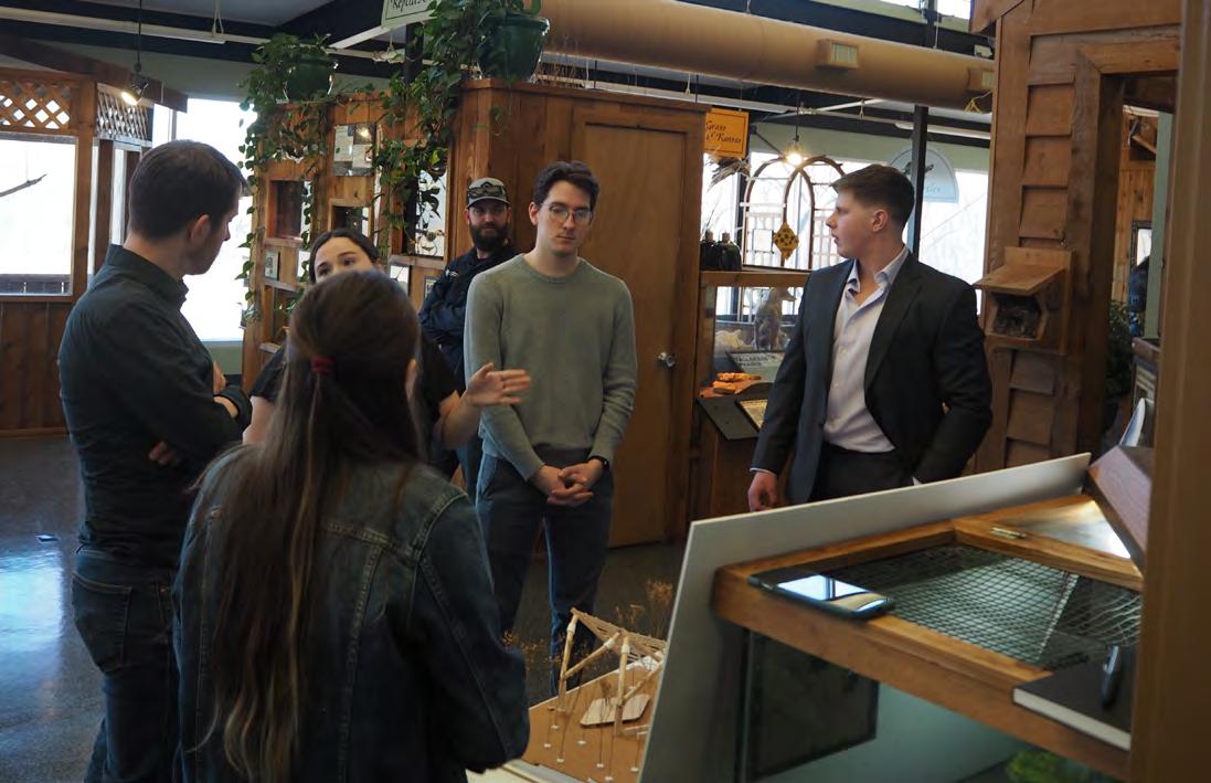During the collaborative phase, the class was divided into four groups whose ideas were morphed into one. The concept that my group landed on was a “doublecantilever” that was essentially two individual cantilevers that intersected each other at the top. My group mates, Wynn Bowden, Paige Butterfield, and Ashley Decker all assisted in explorations into shading, structure, seating layouts, and more. I focused on a possibility for a connection, as well as cladding and sun shading studies. All of our groups then presented for public feedback during a forum at the Prairie Park Nature Center, followed by a presentation to the stakeholders where two final