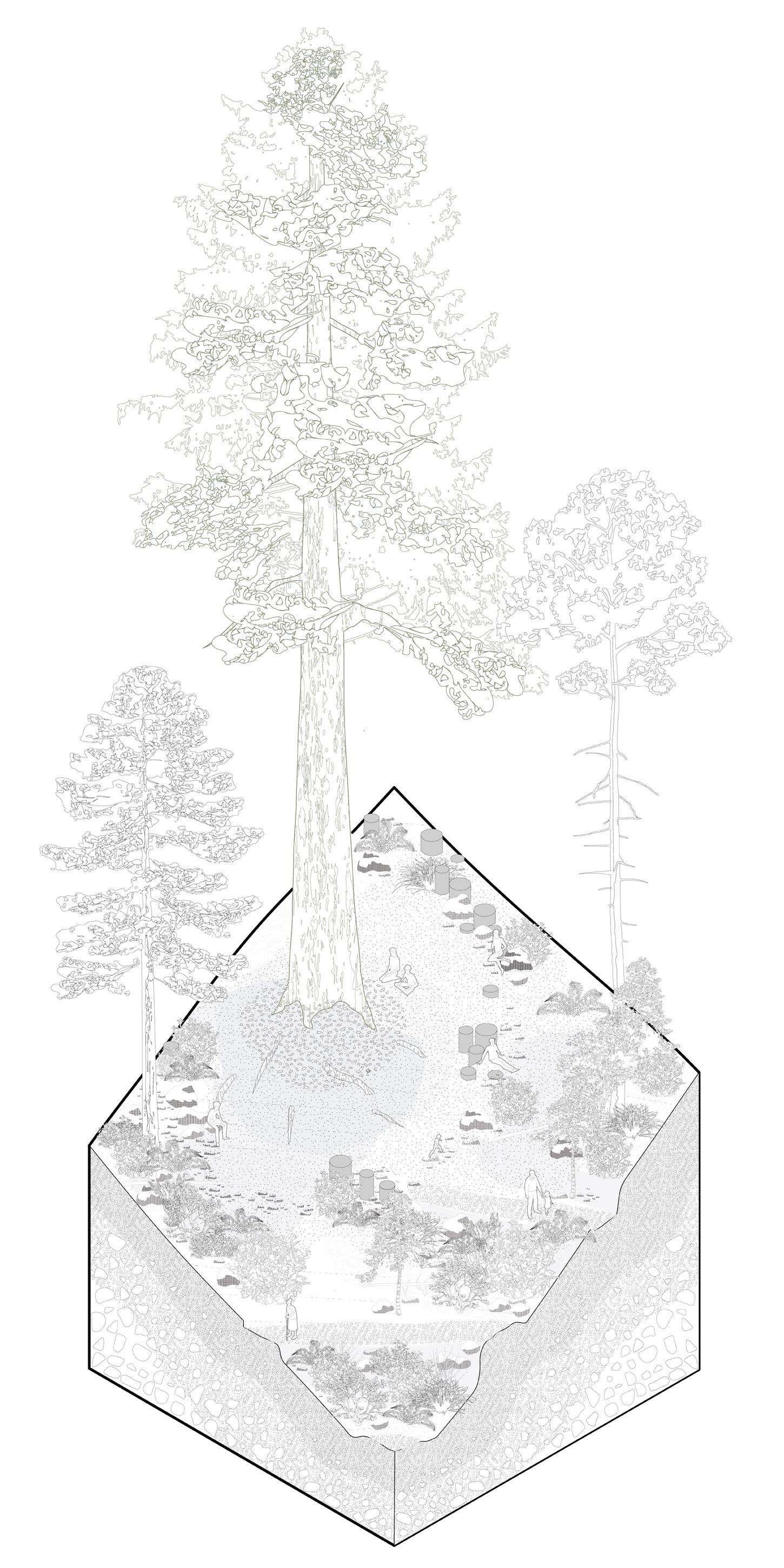This design project aimed to connect with the enigmatic and hidden essence of Wreck Beach by employing dynamic, evolving, and transient materials. Through this approach, we intend to create a space that offers moments of tranquility, introspection, and contemplation. Our focal point will be the Douglas fir, serving as both a silent observer and a central element in our reflection space. This tree will act as a landmark, a sanctuary for confession, and an opportunity for individuals to harmonize with their surroundings. The overarching goal is to craft an immersive environment that invites visitors to feel and connect with past memories that exist around the site, fostering a sense of oneness and inner peace.