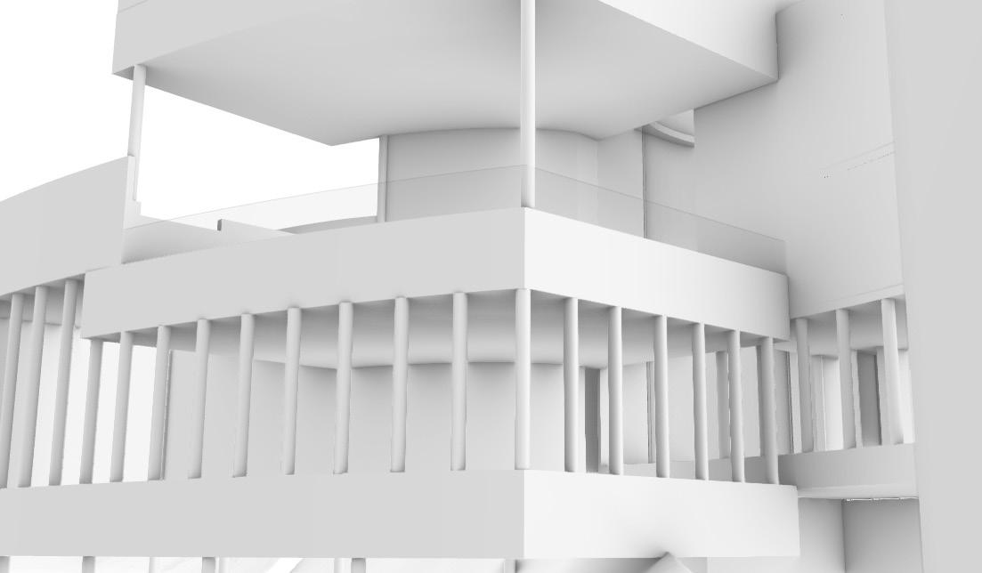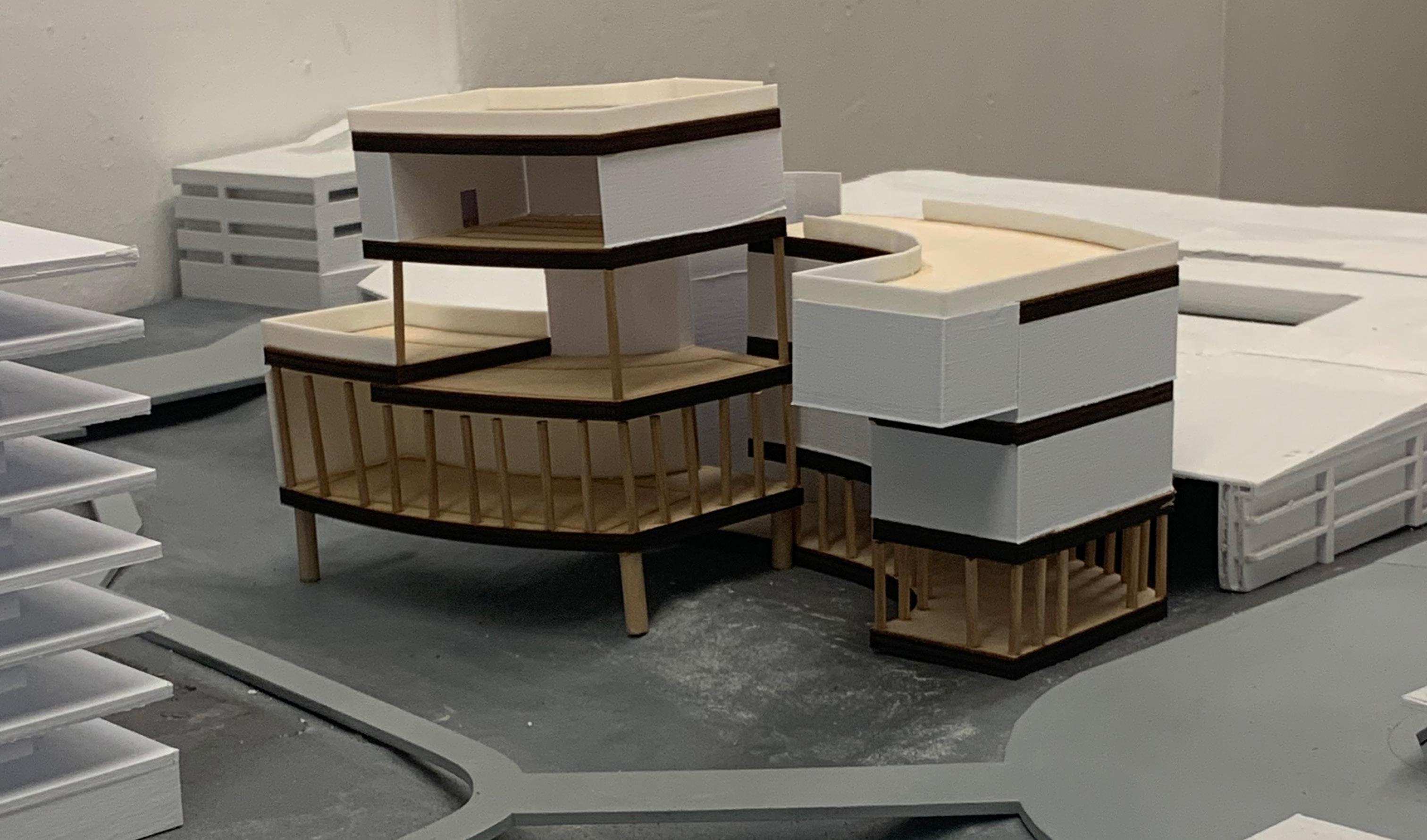 There are models that were used as initial concepts to help develop my projects throughout the semester. The first model image uses acrillic and 3D printing to show a contrast to solid void. The second image was an experimentation with plaster and wood forms to create negative space. The final image was a cardboard study model created through Rhino 7 and laser cutting to show spacial relationships while using the linear nature to not hide the spaces with in.