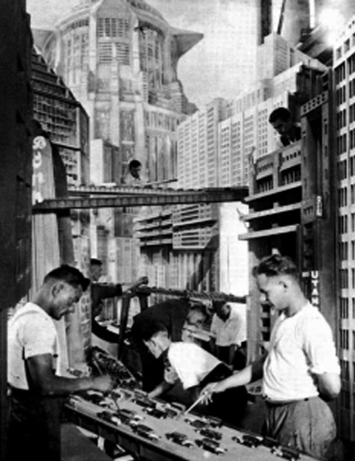 century causing the technological possibilities to be limited when filming and curating sets, this is clearly visible when seeing the design and construction of said sets. Their use of smaller scaled models to create scenes of larger objects (figure 10) to create these visuals for the city of tomorrow. It is also interesting to highlight the way in which they used these sets to record the scene, each camera man becomes immersed within the action along with the characters reflecting the skill required for a low technological film. Due to the impossibility of using CGI and other methods of digital adaptations the use of small-scale model work has been used, specifically for the icon shots of the vertical city, the capital building and the diverging roads and planes as seen in figure 11. This highlights the detail required to develop such a scene and sequence as each still of the city vista shots had each car moved one millimetre per frame, creating forty metres of film behind (Minden and Bachmann, 2002). This then impacted the ability of sequential manipulation allowing Lang to adapt and manipulate the city itself.