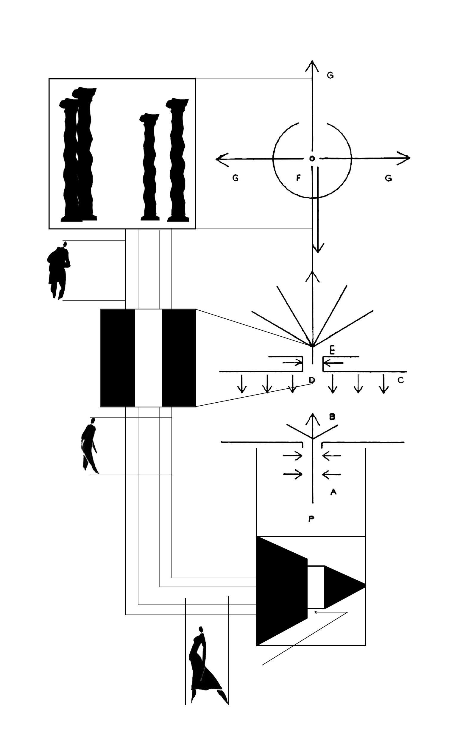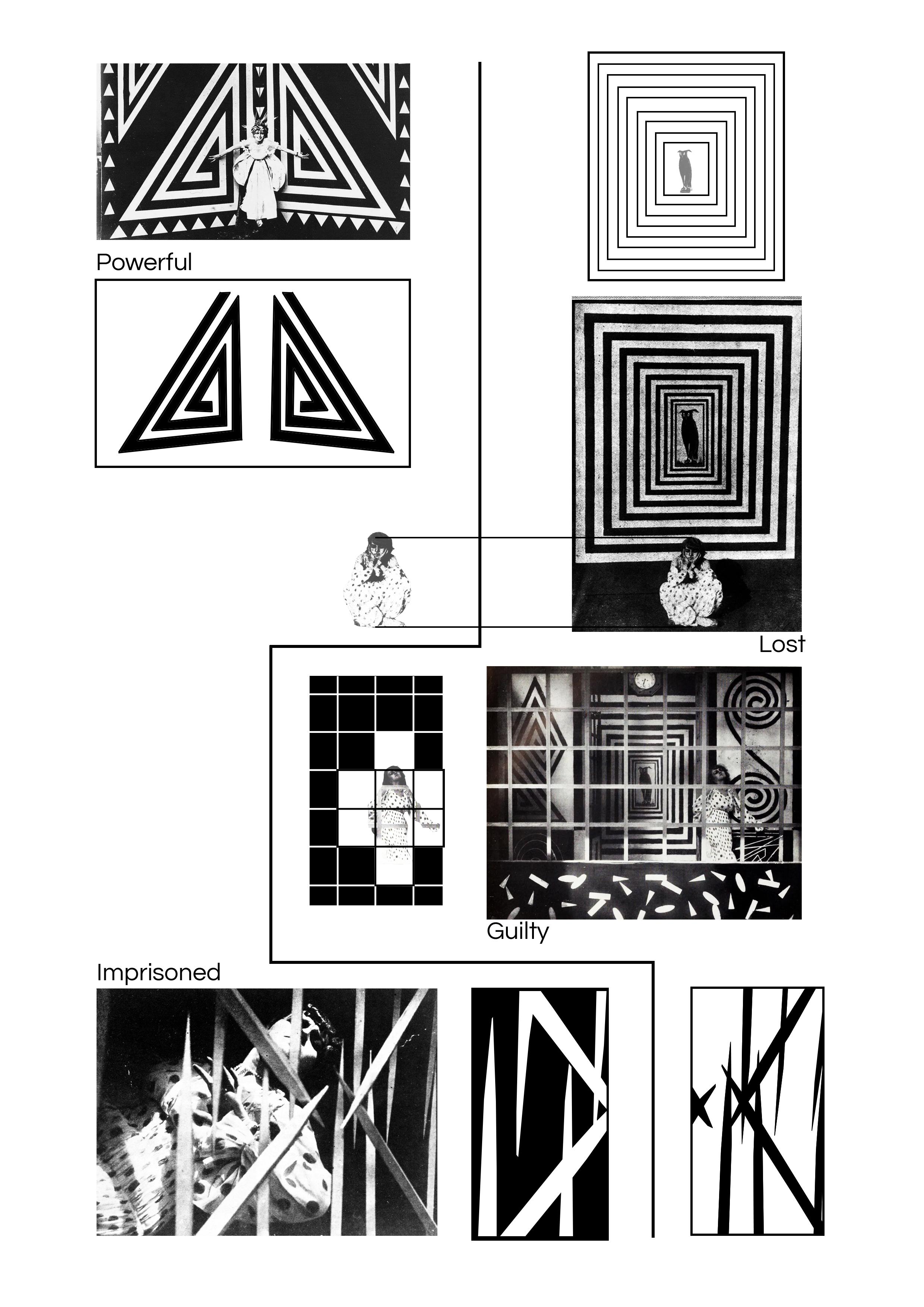 is perceived. (Berghaus, Pietropaolo and Sica, 2018) Through the progression of geometric architecture Prampolini begins to add elements of chaos aiming to highlight the descent of the Slavic Duchesses mental state. He uses this abstraction of shapes to create depth within each scene carrying more and more intensity along with them. figure 6 represents this use of geometry and depth as it maps the final stages of the film, articulated in a style influenced by Bernard Tschumis sequence mapping. As the film progresses the sharpness of these geometric shapes begin to appear more powerful and impactful on the scene. Referring to figure 6 and comparing the first scene, containing art deco inspired triangles, and the final scene, composed of sharp jagged steel framework, it can be seen that Prampolini was influencing the narrative and sequence with his composition of set design. One could reflect on this change in materiality to mean a change in mental state, the Duchess appears calming and ‘regular’ much like the triangular shapes. However, by the final scenes she could be considered to have evolved into something harsh, cold and erratic much like the collapsed steel framework. Following on from the previously