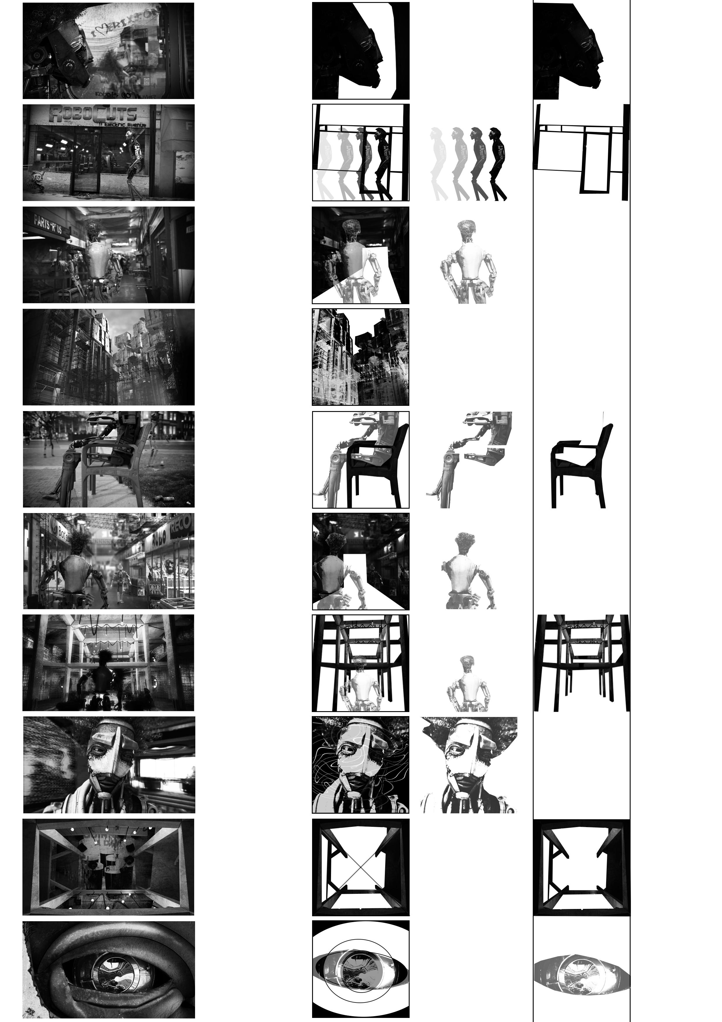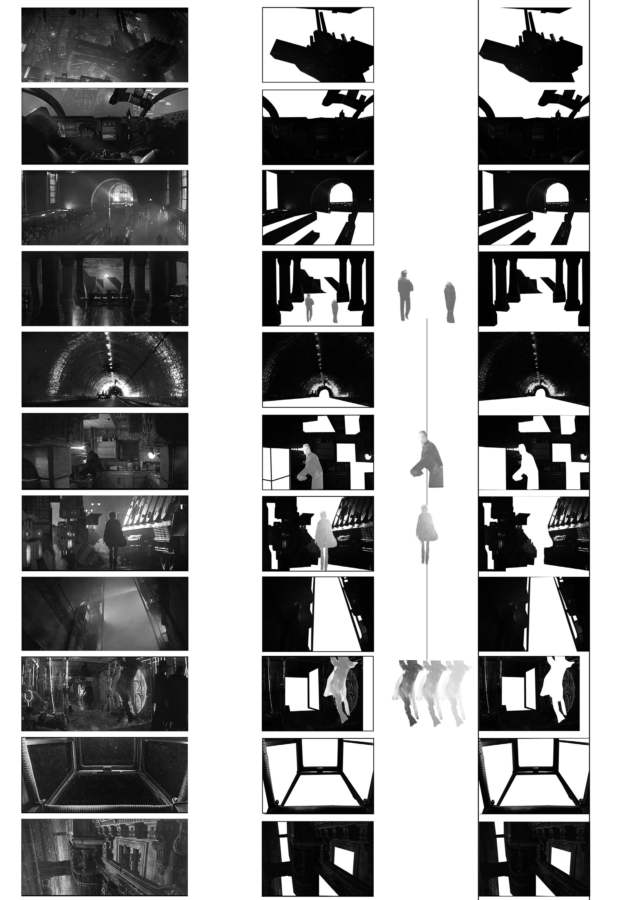 Figure 8: ‘The Fall’ Bernard Tschumihow the architecture has dictated the directional movement of the sequence. Directed by Kibwe Tavares in 2011, the Afrofuturist film ‘Robots of Brixton’ became a highly discussed representation of the future, that aims to forge a dystopian representation of the poverty and disassociated social hierarchy of London life (Bould, 2019). Throughout the sequence it begins to pan to and from historic outbreaks of racism and discriminatory rioting within the community of Brixton. Kibwe uses interpretations of futurist brutalist architecture that looks to be parasitic in its technological nature, possibly imitating the implied governmental view towards the black community of Brixton. Figure 9 Shows a narrative breakdown of the cinema previously discussed in which Kibwe begins his narrative sequence through an aspect view of the main protagonist, who navigates through the architectural narrative. To fully study how Kibwe has generated this sequence one must tear the character from the journey to fully understand sequential make up of each scene, to view the architectural factors of the set. Robots of Brixton as a narrative follows that of a lead protagonist embodied through a “skinny and dully looking” humanoid robot who walks the streets of the new Brixton. Kibwe uses the architecture of the set to influence where the character moves, the diversity of camera angles, zooms and frames allowing the watcher to experience this journey for
