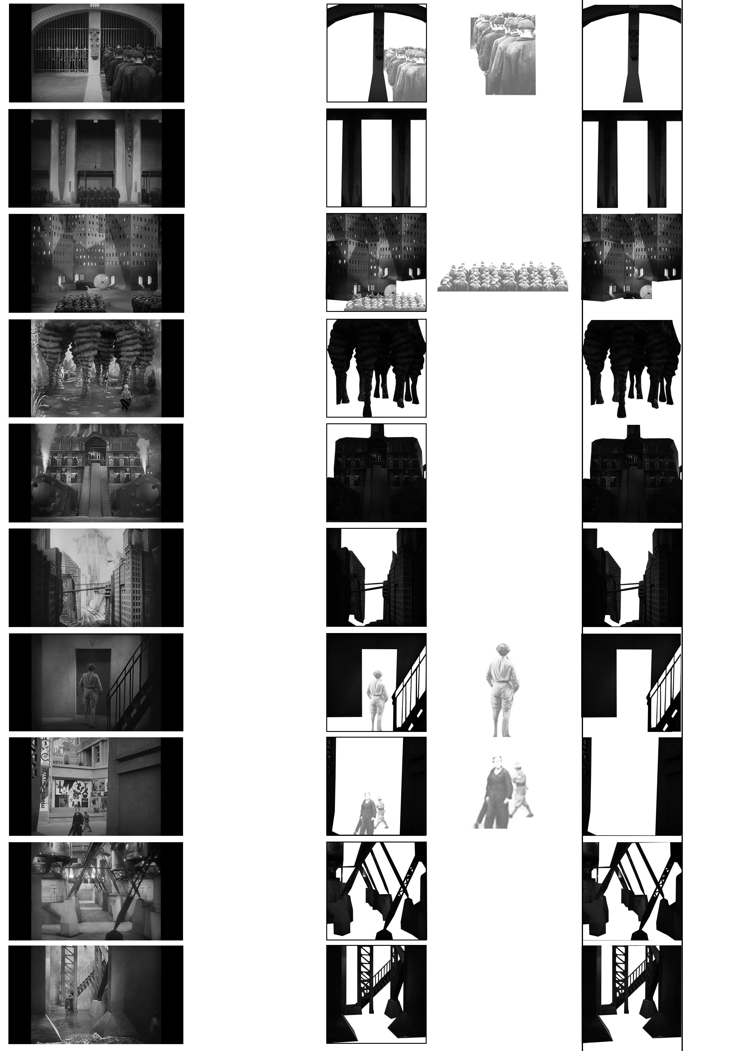 tore the subject from the frame to leave the structures behind leaving visible evidence of sequential manipulation. As a final method of consolidation to the found evidence a comparative combination map was developed finding moments of similar architectural influence between each of the researched cinema.