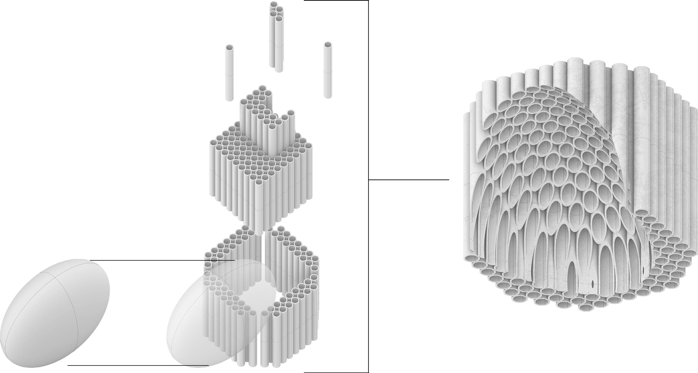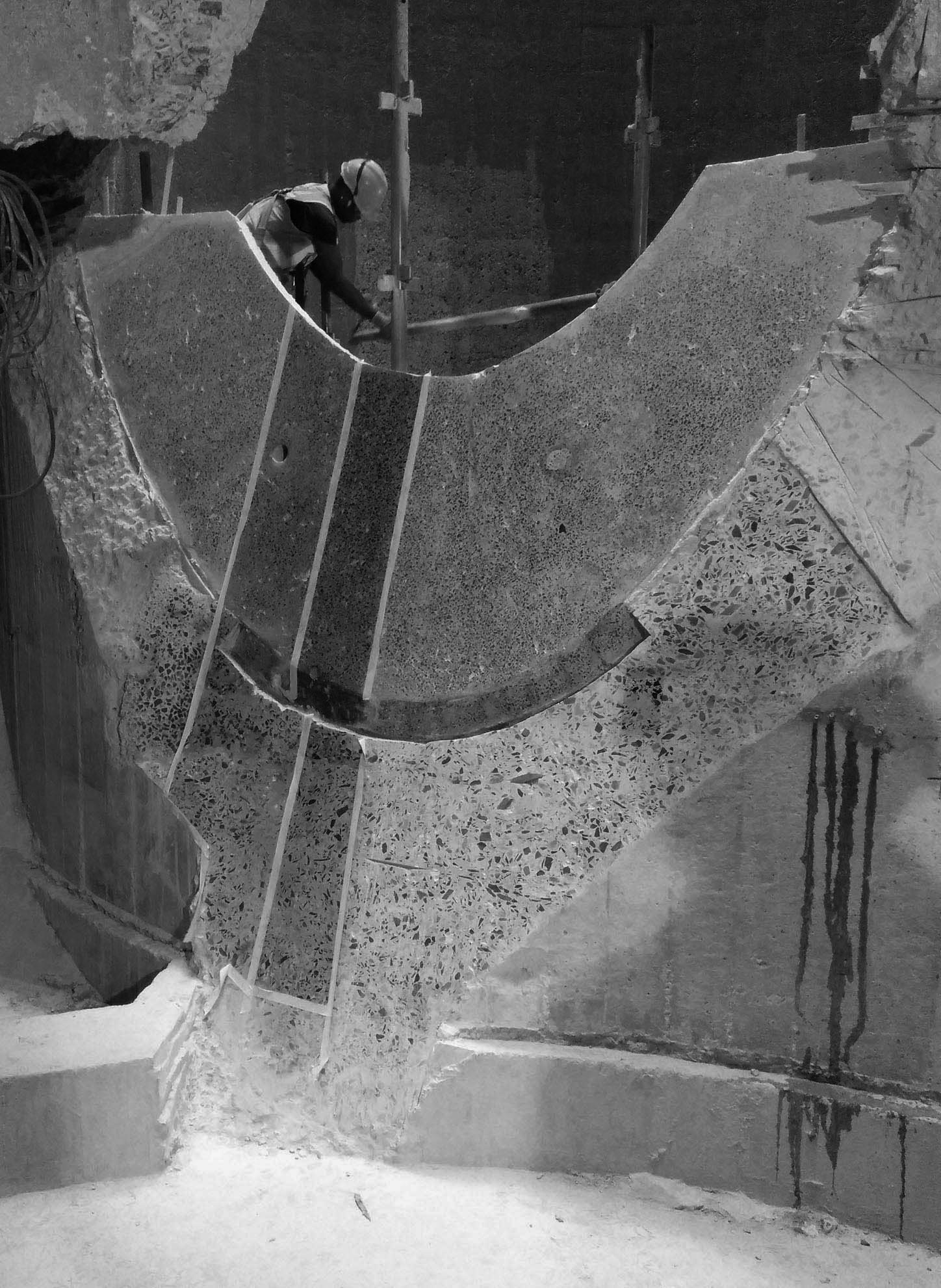 The existing columns are eroded down to create a smooth opening in the centre. It’s finalised aesthetic is something of deep beauty and opens something that is considered poor architecture, due to its industrial use, into a sculpture of fascination and incredible detail.