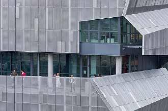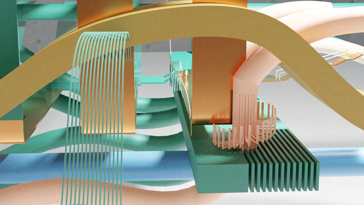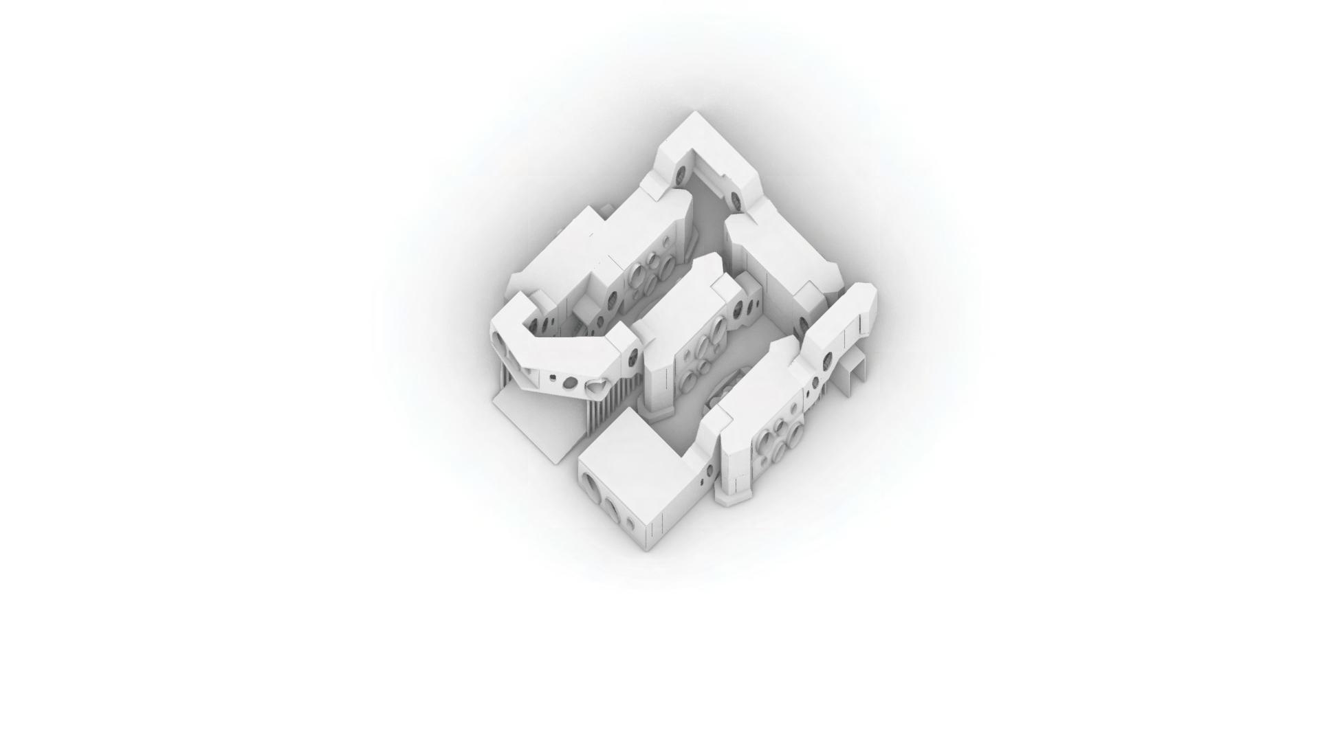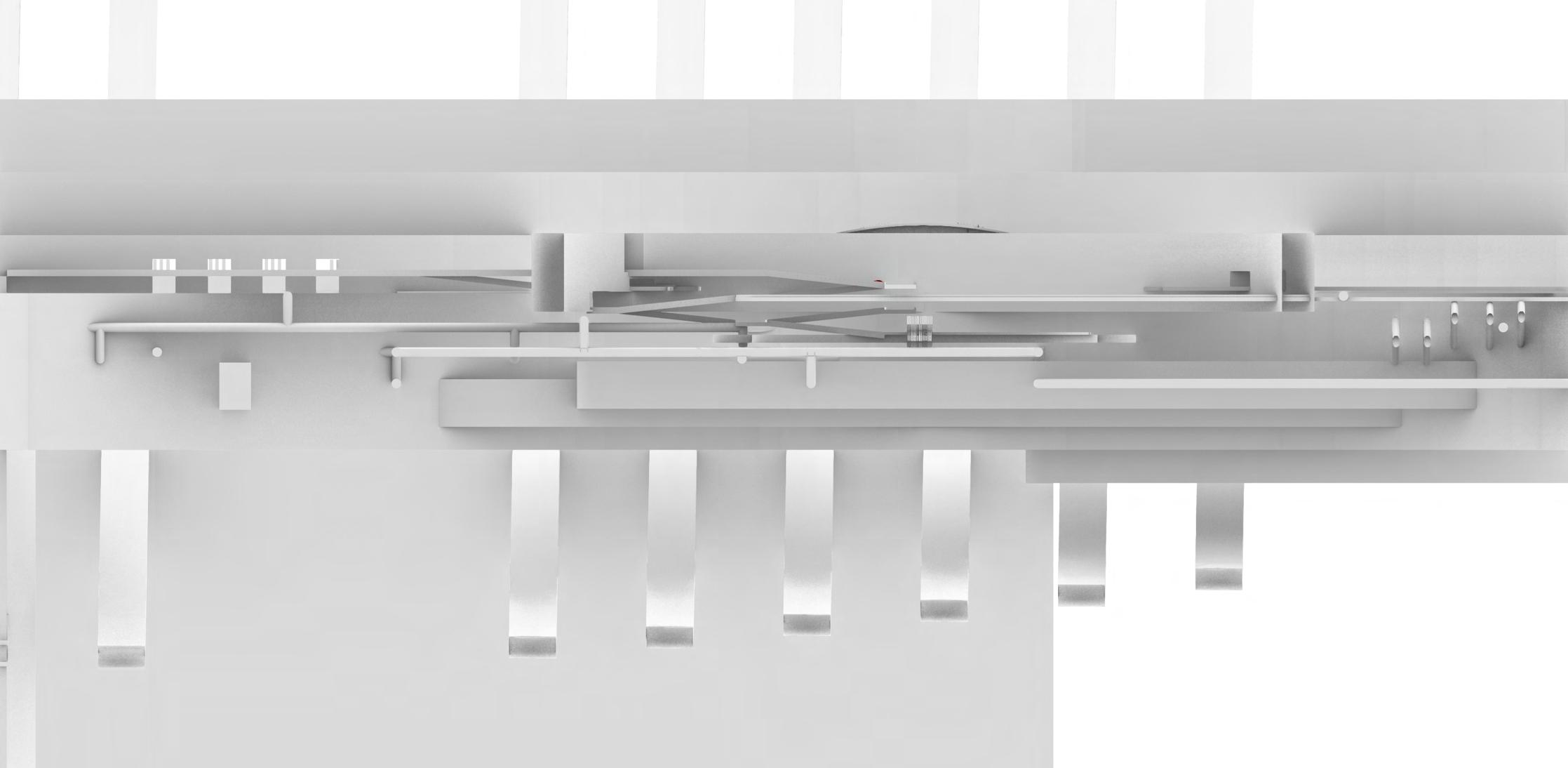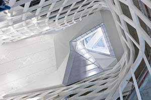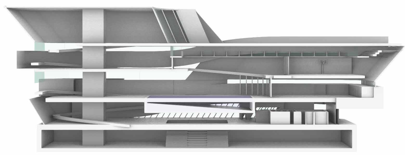 Intersecting sky bridges carve a circulation path into larger volumes creating a dynamic experience with light and shadow