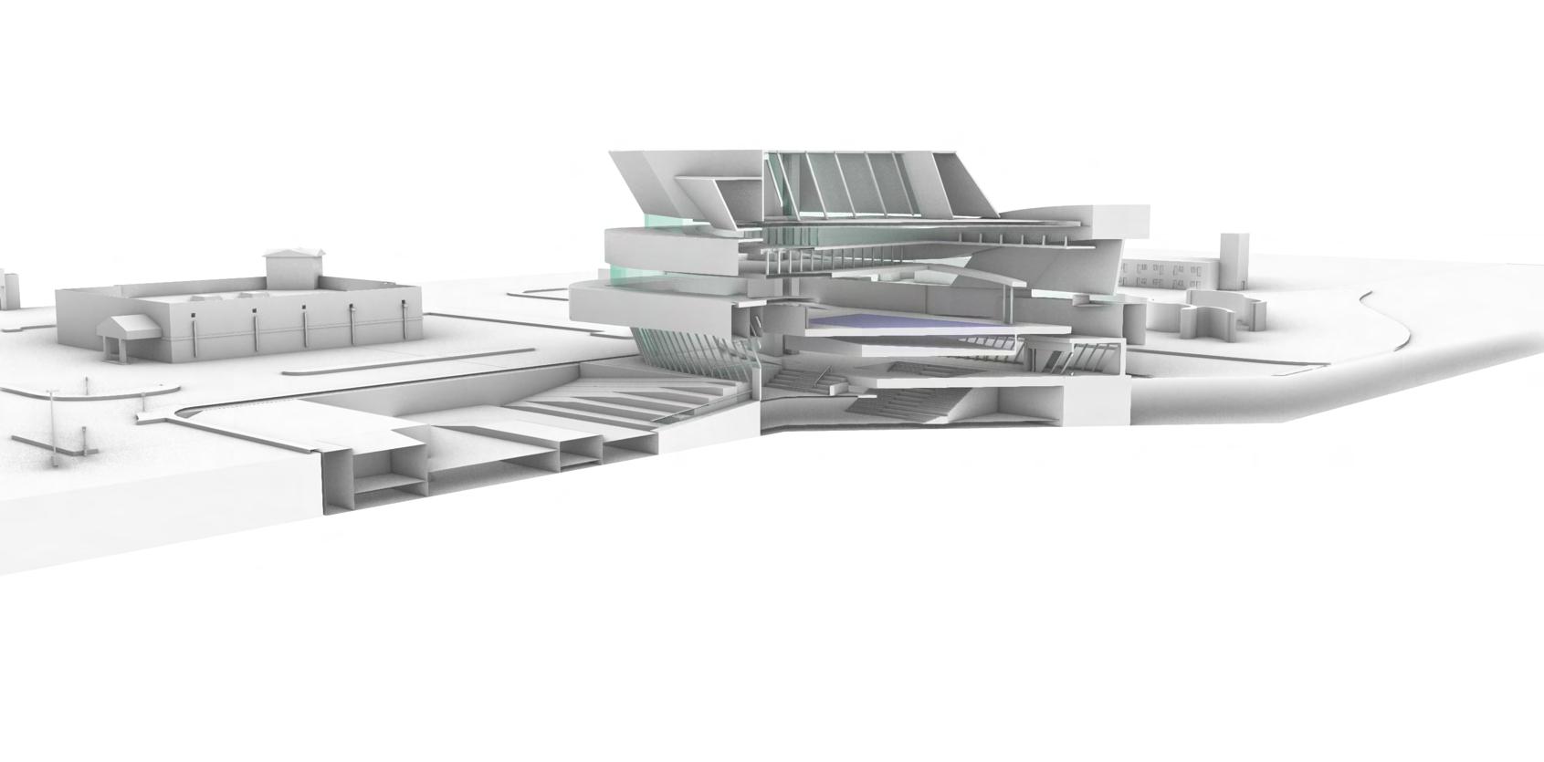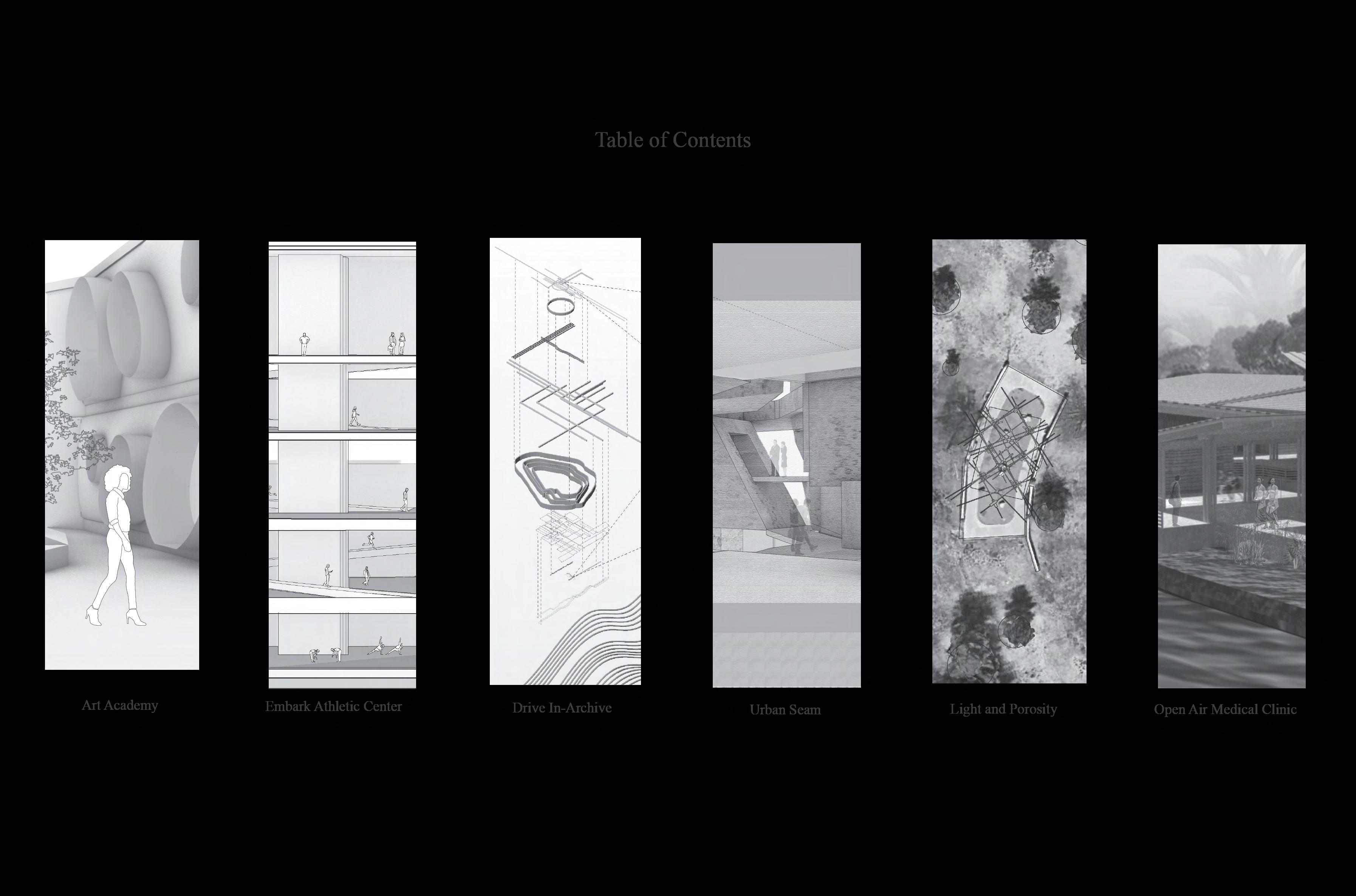 The Embark is a proposal for a community athletic center near the downtown district of Lubbock, Texas. The structure embodies community while promoting energy and movement. Through site analysis and program configuration, the building provides a dynamic response in which the primary entryway is a system of ramps enveloped by an elegant bosque, inviting the user to gradually descend into the underground fitness floor. Ascending through the primary stairway or elevator core, reveals five additional levels that are connected through a dynamic ramp system that alternates in size to generate a circulation that allows opportunity for passive or active activity. The Embark is a collaborative building that features a glass swimming pool,an indoor sports facility, and a rooftop tennis court.
