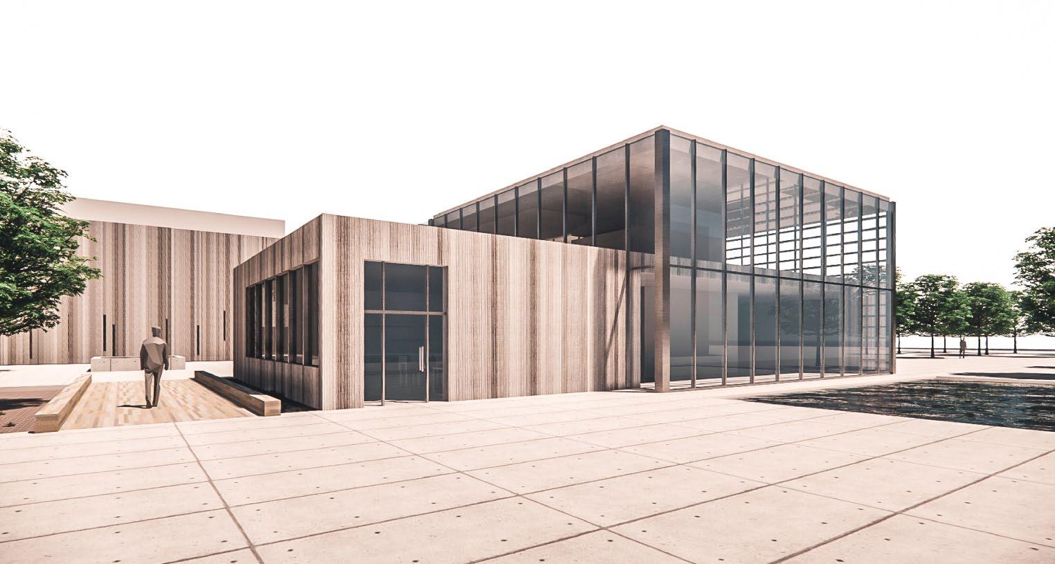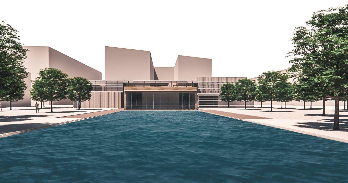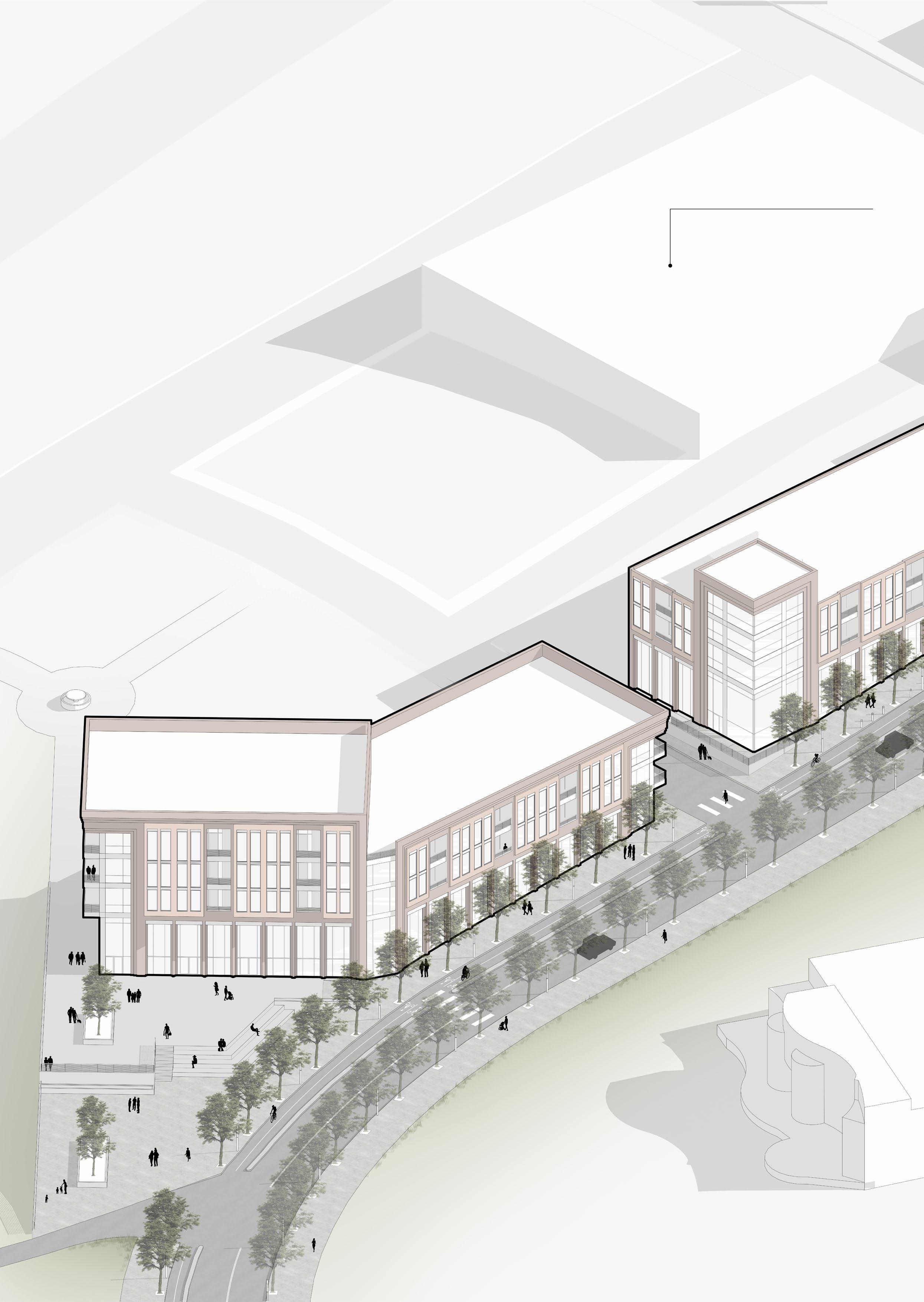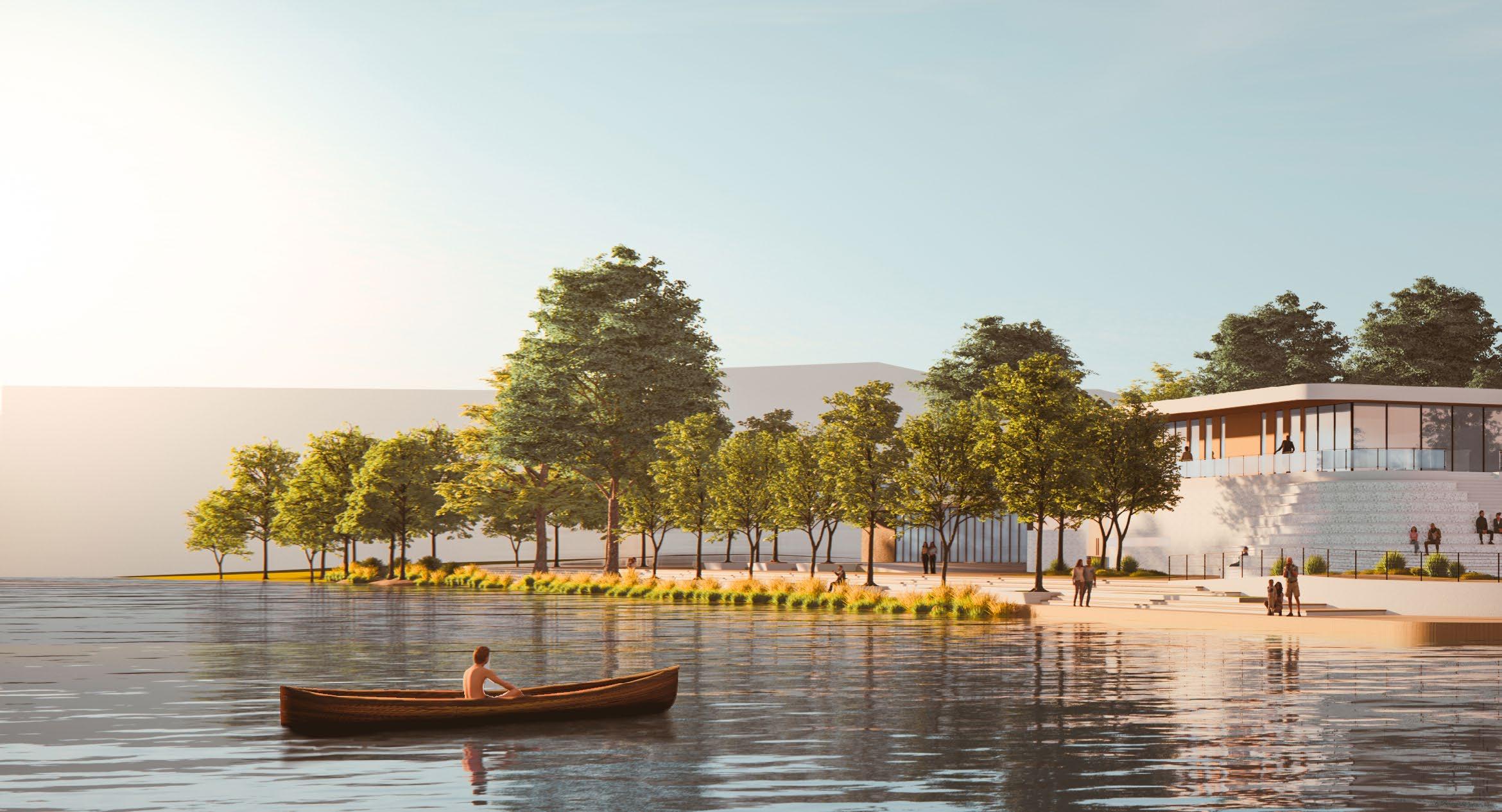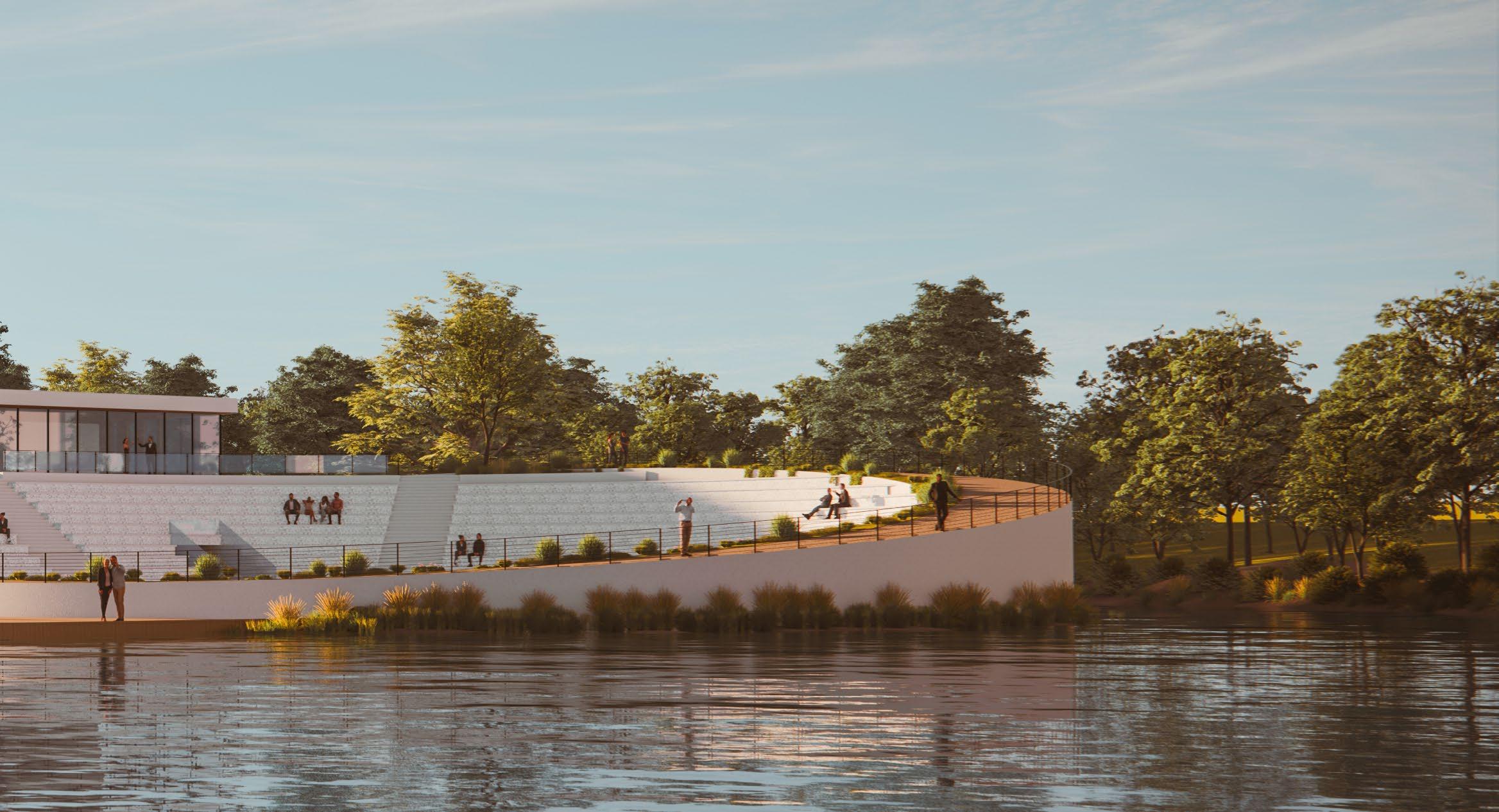 The render depicts the amphitheater emerging from the riverbank, integrating with the renovated structure above.
