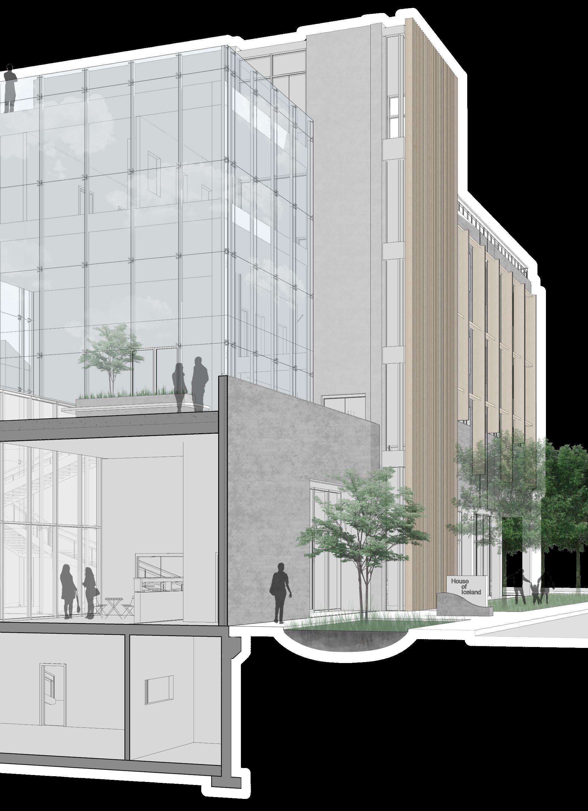 As we peel back the north side of the building, we can see the cafe, connecting the public to the embassy. Icelandic culture utilizes the cafe to bring people together, and we felt it appropriate to have this as the connection that draws people in. We also implemented an occupiable roof above the cafe to create another outdoor space and additional greenery.