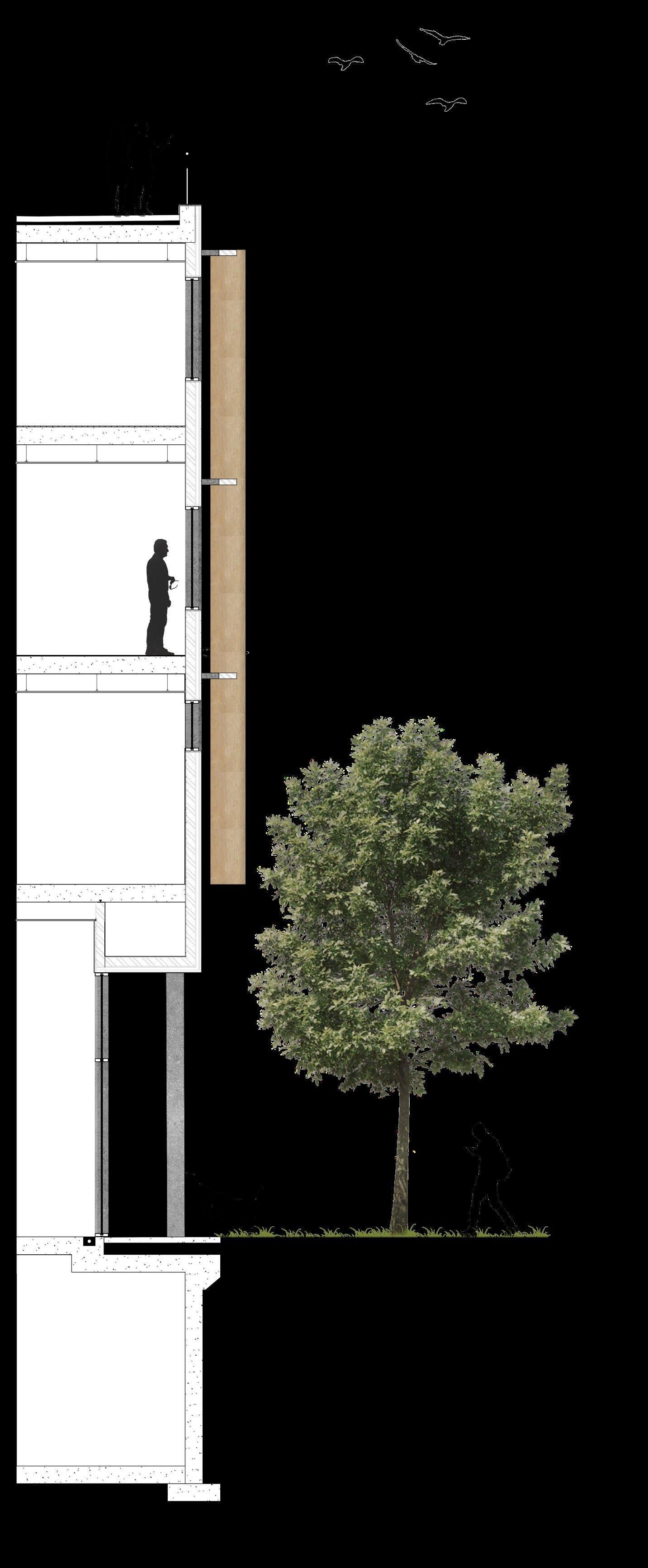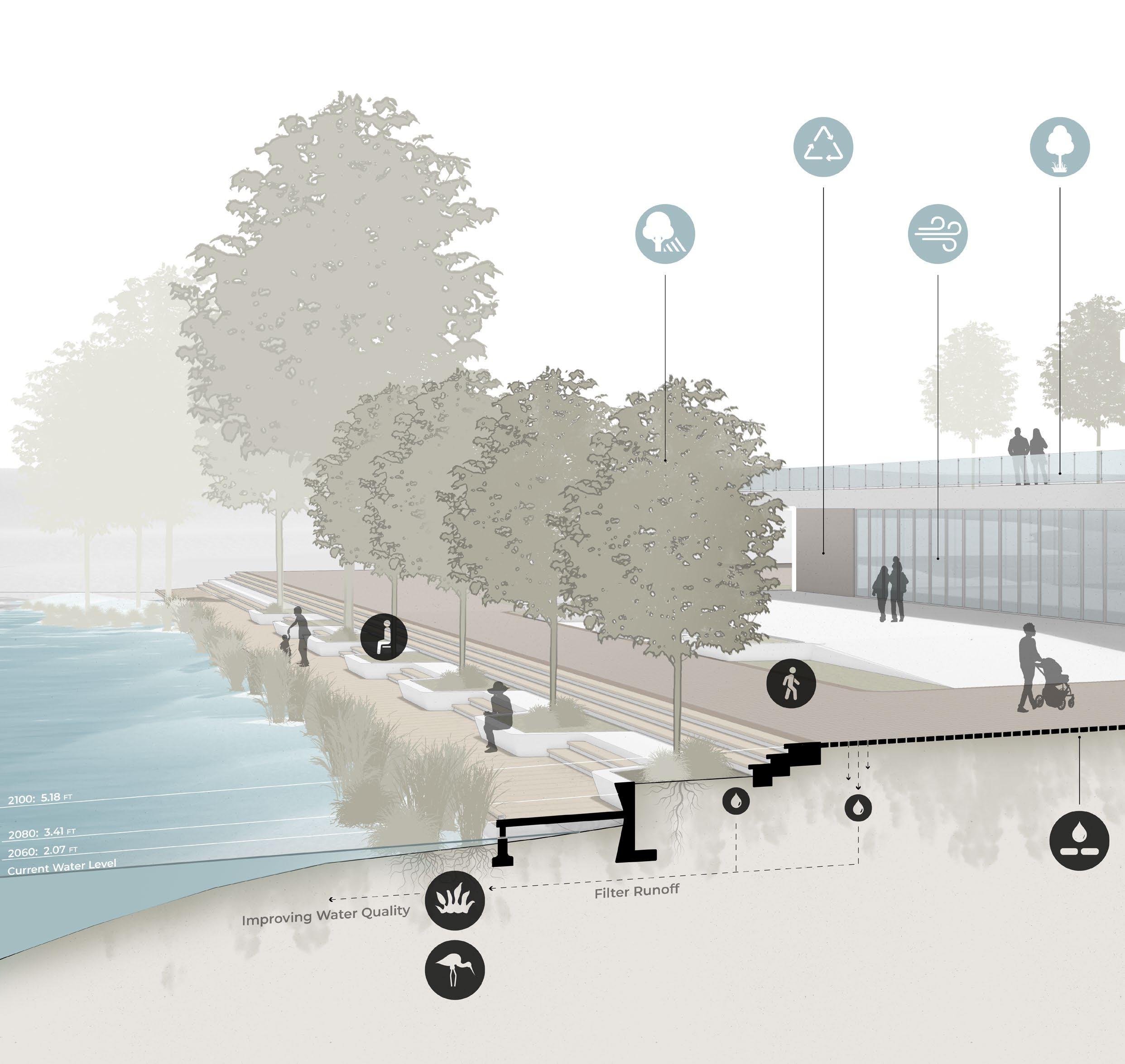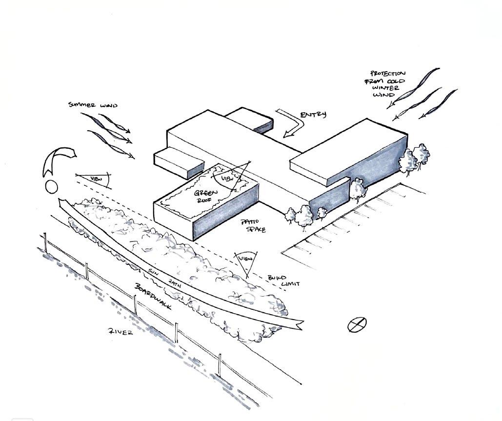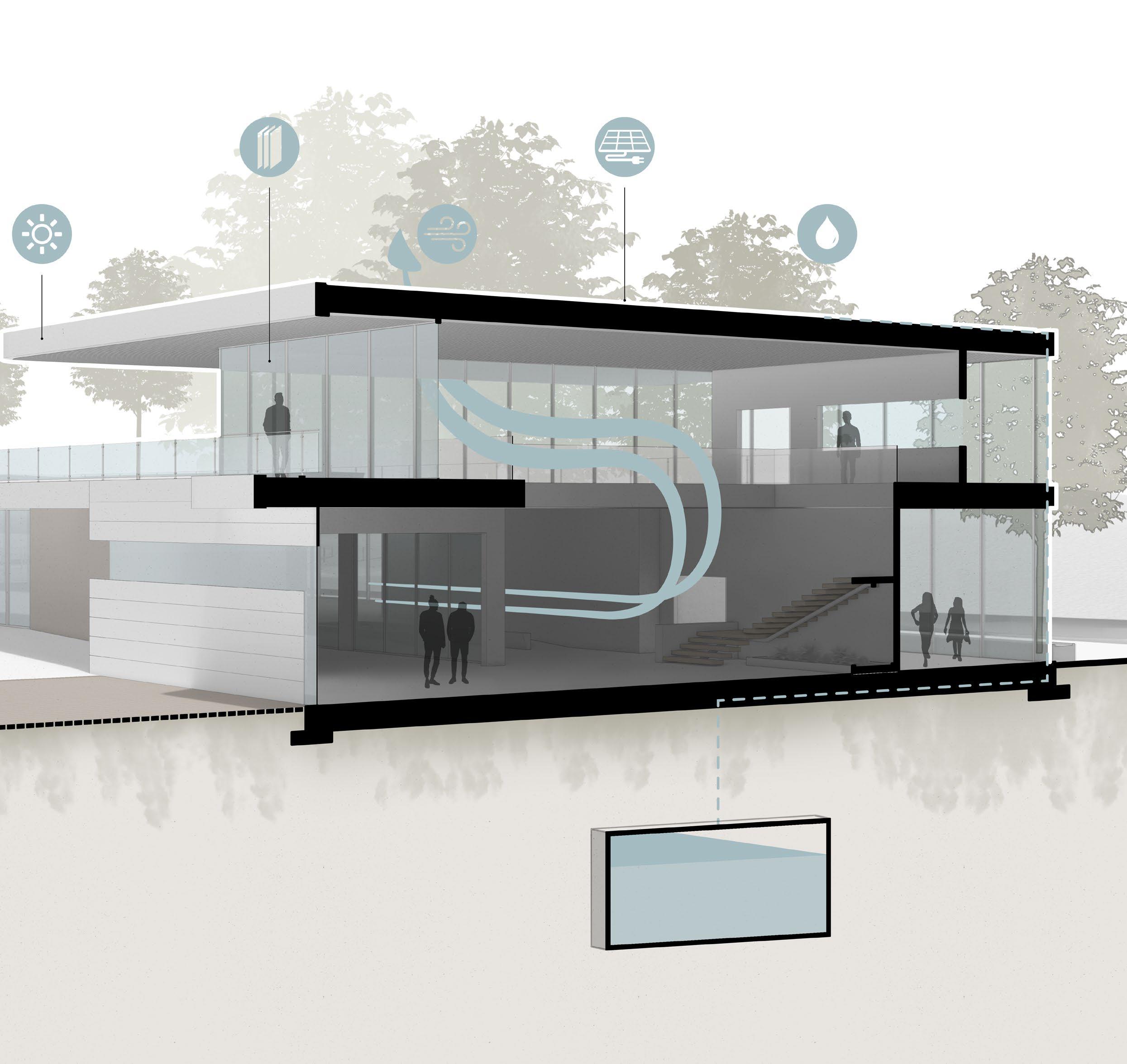 At the heart of Riverside Oasis is a commitment to sustainability and adaptive reuse. The design repurposes portions of the existing boathouse, integrating them with new architecture powered by renewable energy. Solar panels provide clean electricity, while a green roof offers natural insulation and supports local biodiversity. Southern shading devices enhance comfort and reduce energy use by minimizing solar heat gain. Constructed wetlands and permeable floodplains stabilize the riverbank, encourage native plant growth, and manage stormwater runoff. A rainwater