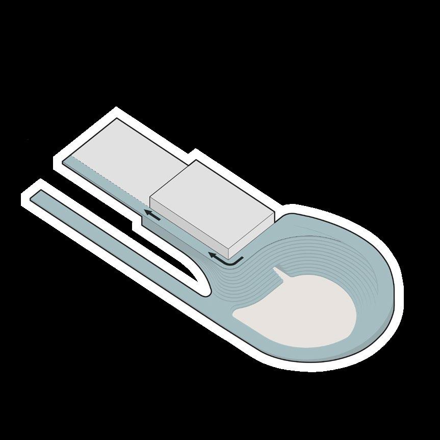 A gently sloping ramp connects the waterfront boardwalk to the second floor of the existing building, forming a natural transition through the site. This gradual rise creates a bowl-like amphitheater, with its lower end opening toward the river, framing expansive views and enhancing the connection between the performance space and the surrounding landscape.