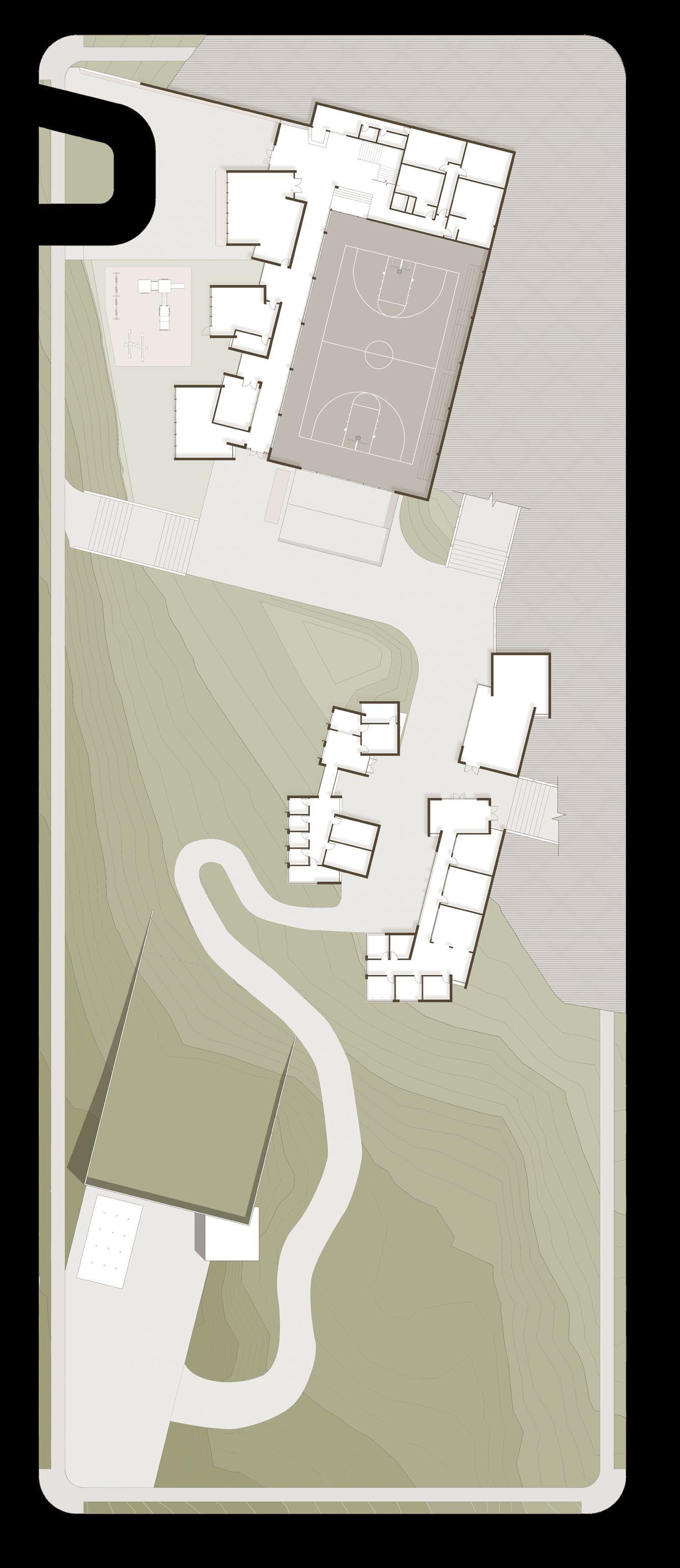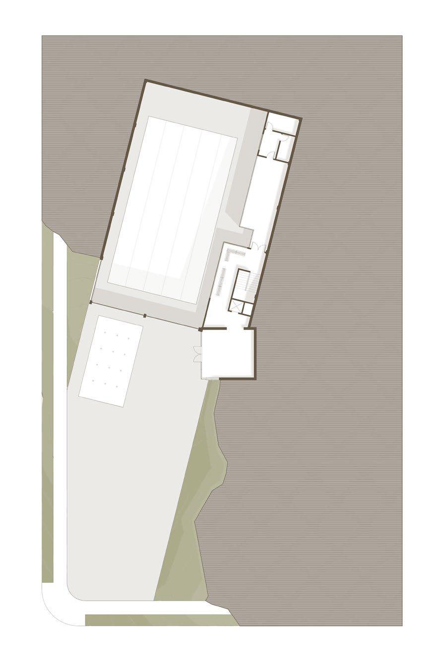 The main entry on the western side is integrated into the existing topography, limiting the visual impact of the large gym space.