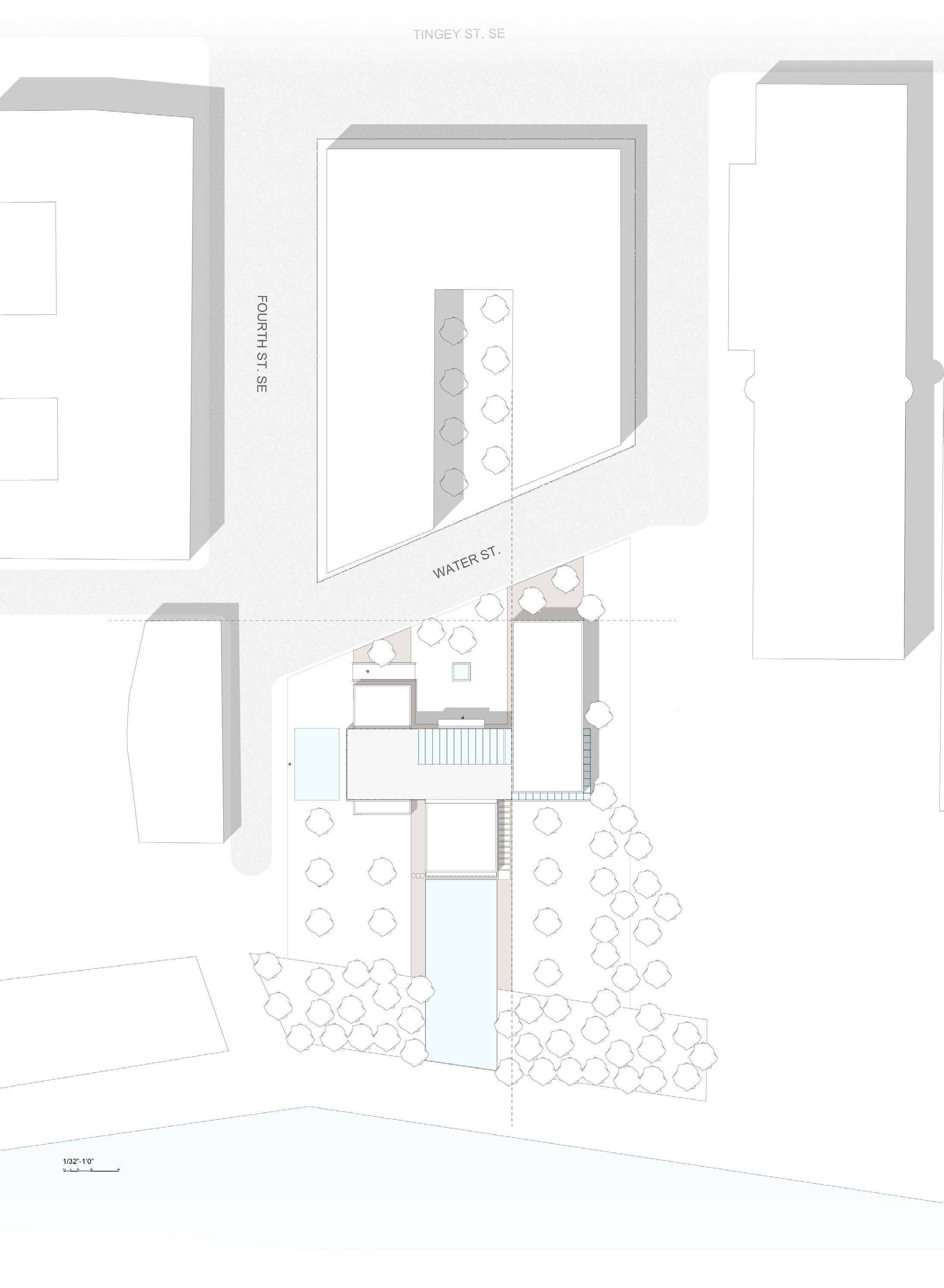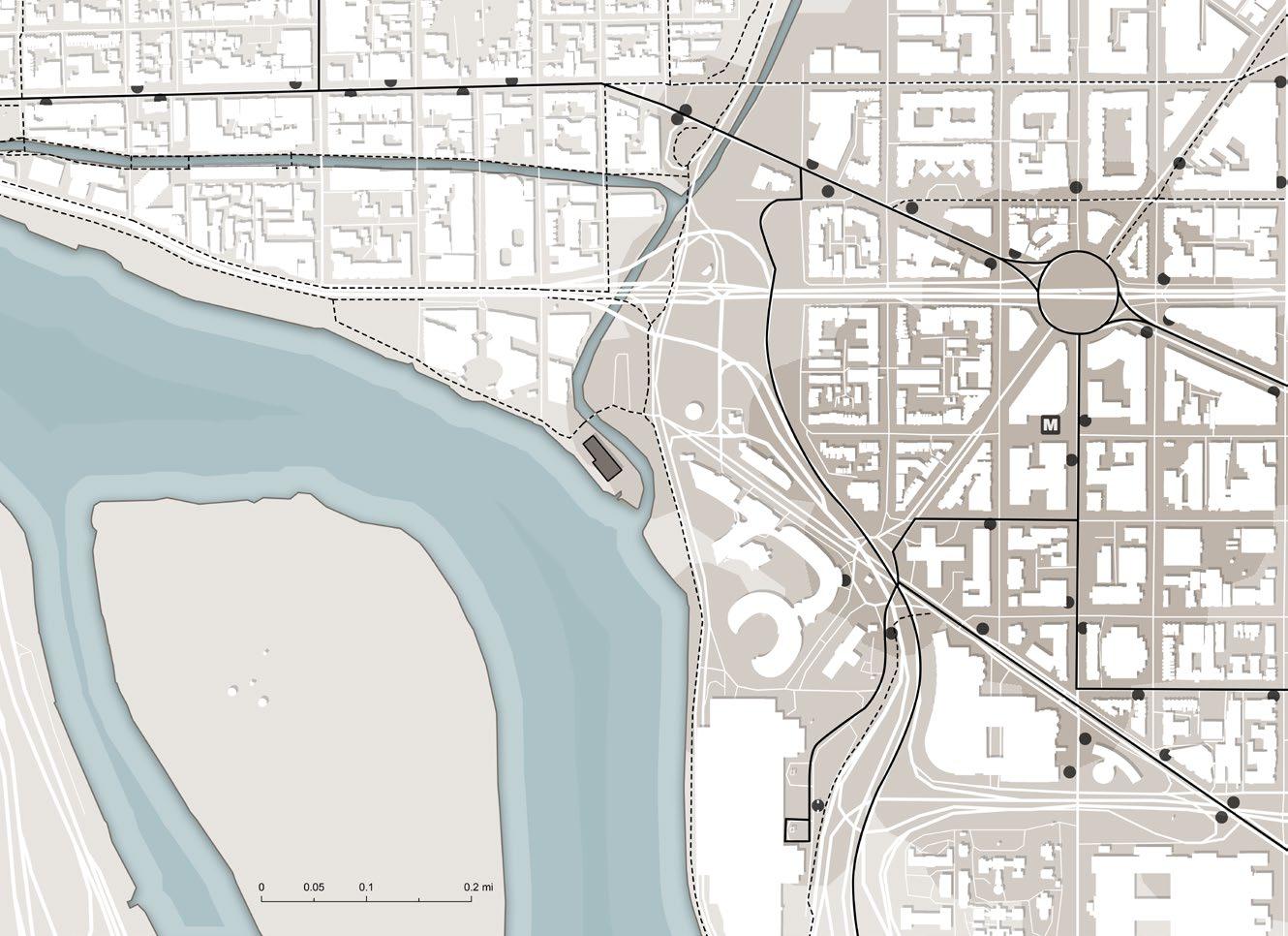 I began by creating a horizontal volume divided into three parts. The left space for public, center for views, and the right for private. Those spaces were then extruded to and from the river, directing the occupant toward the views of the Anacostia. The height of the three voids then step up as they move from the public street toward the private museum functions.