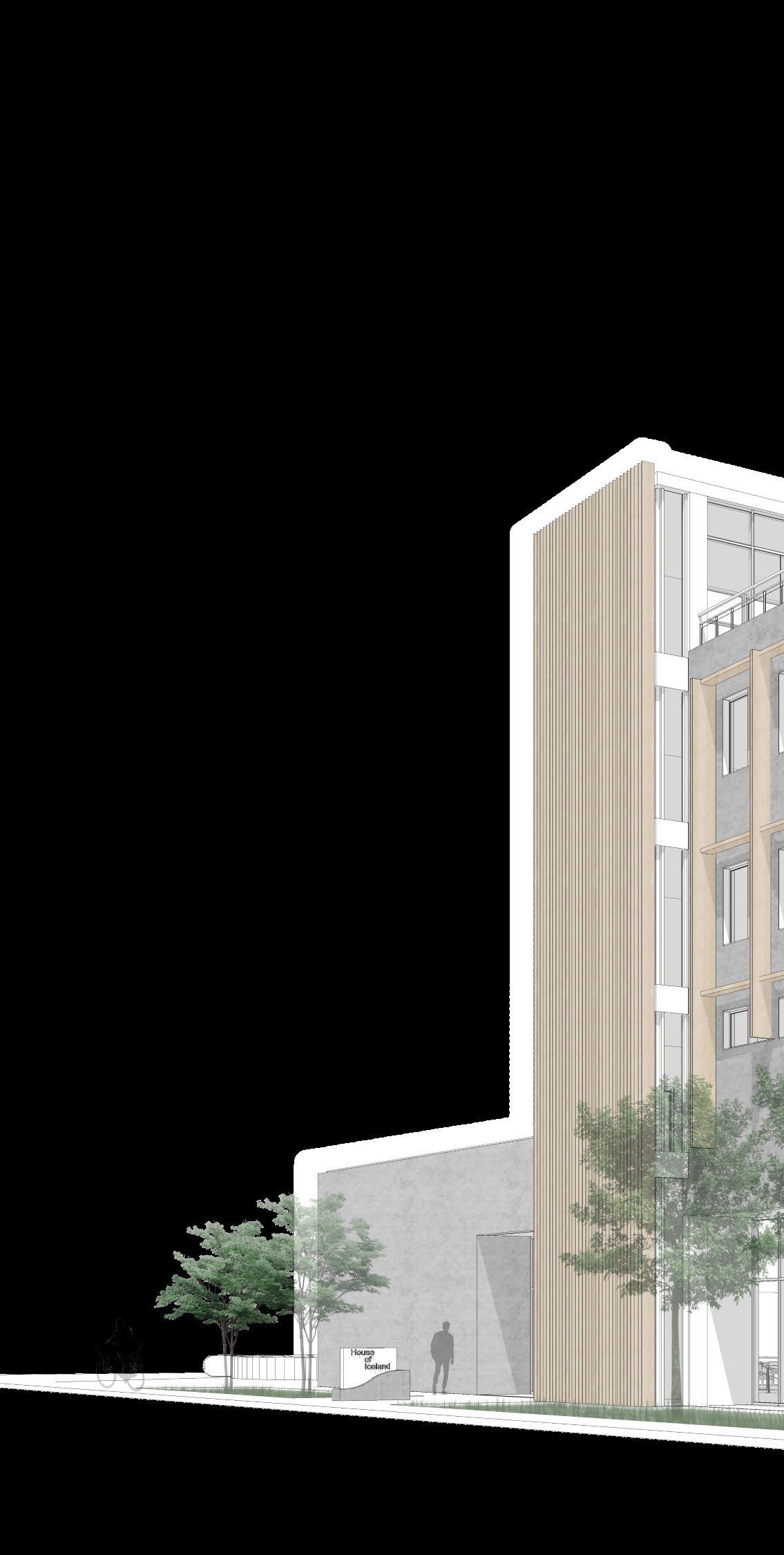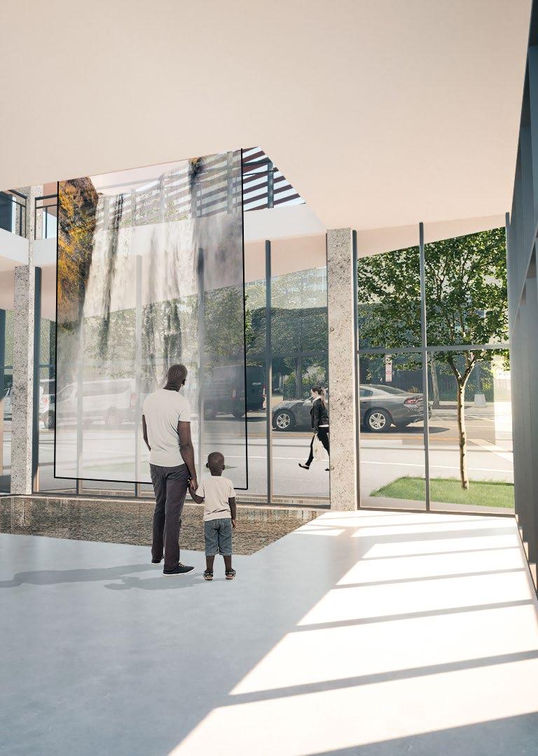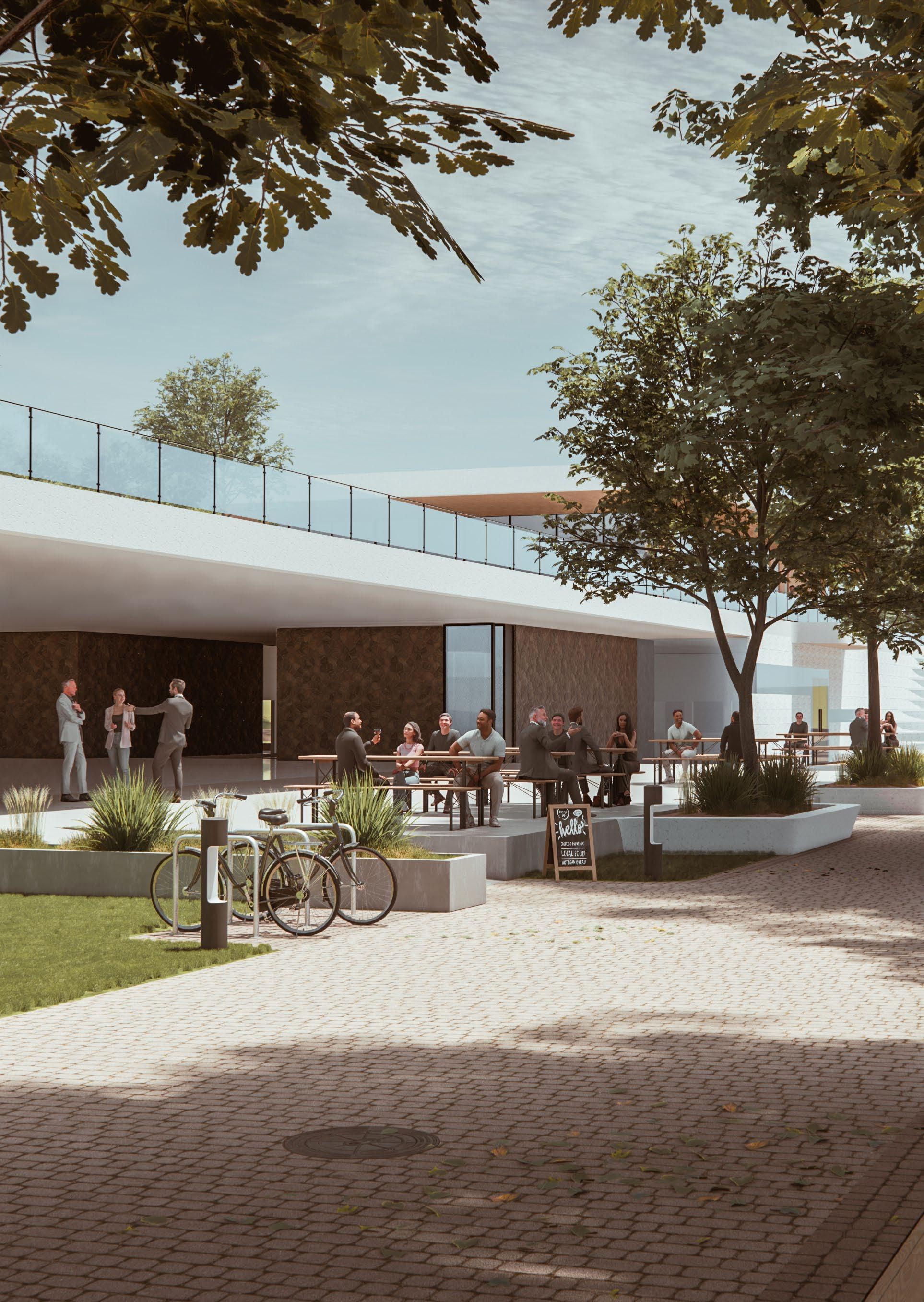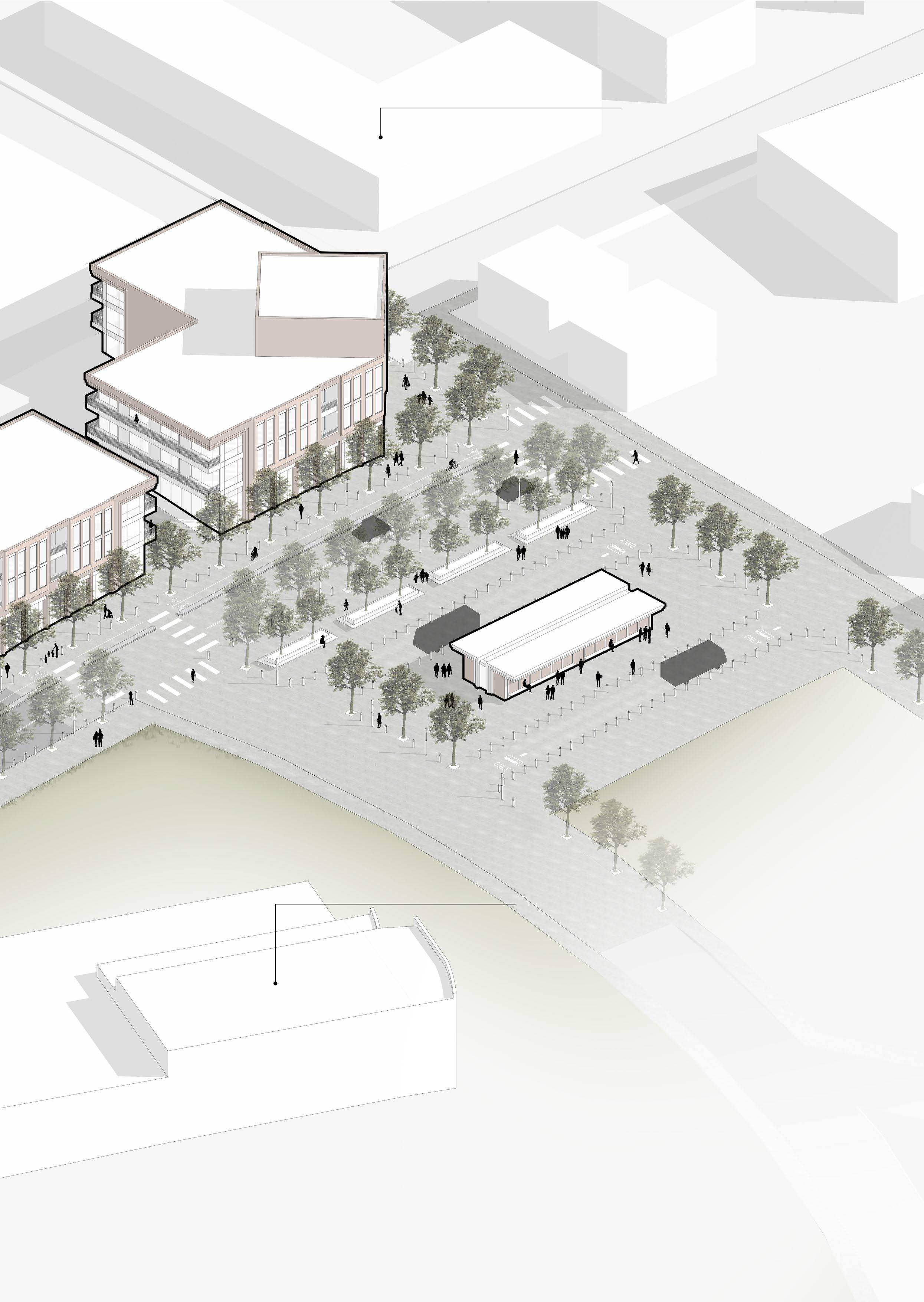 Three mixed-use buildings front the street creating a strong urban edge. The commercial space occupies the ground level with open glazing, while the apartments sit above. There are two plazas located at either end of the site with the hyperlocal transportation hub on one end. The street level rises to meet the curb height creating one level around the station for easy pedestrian access.