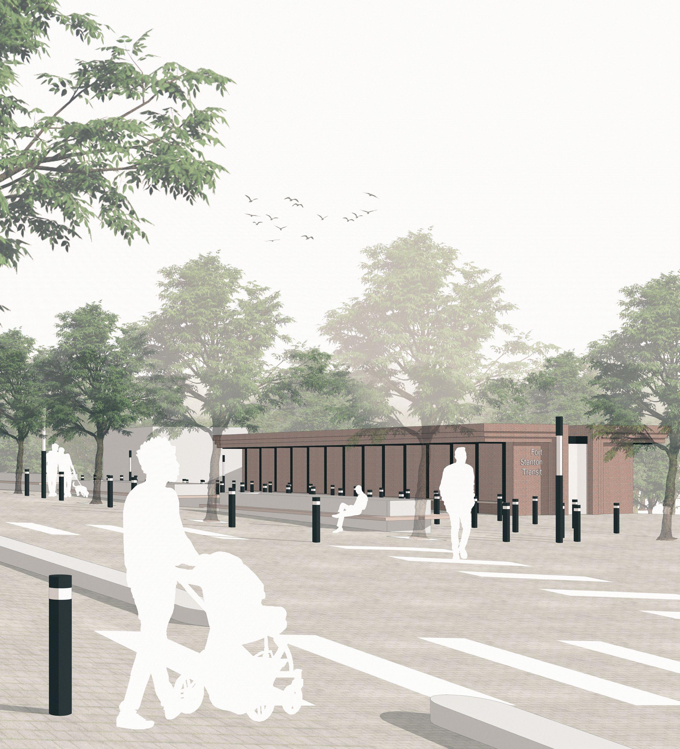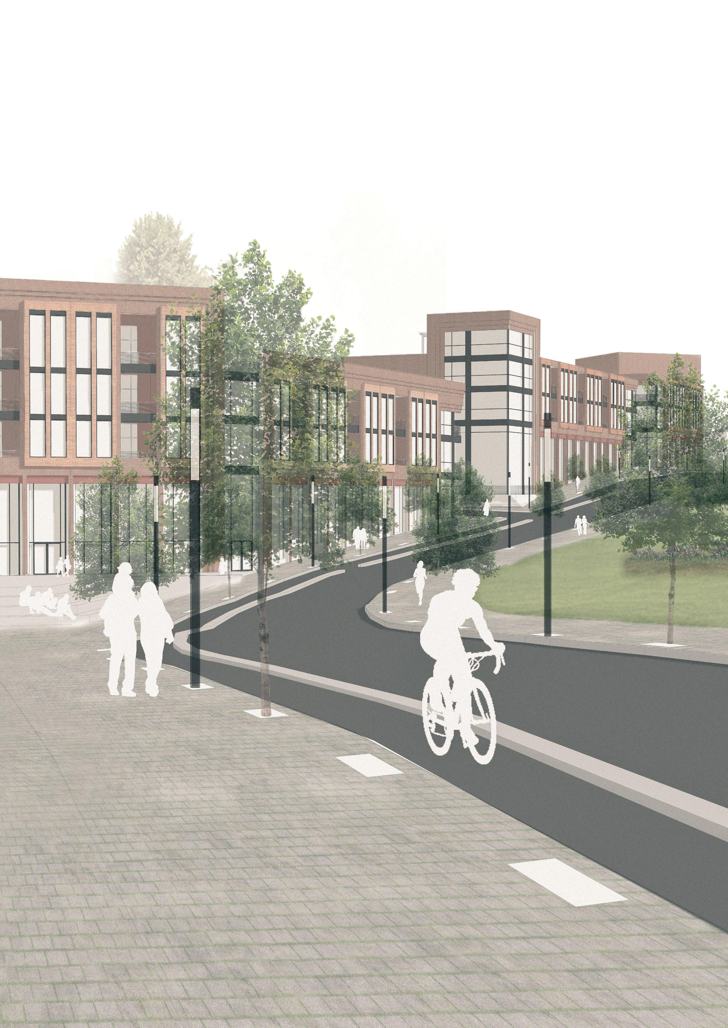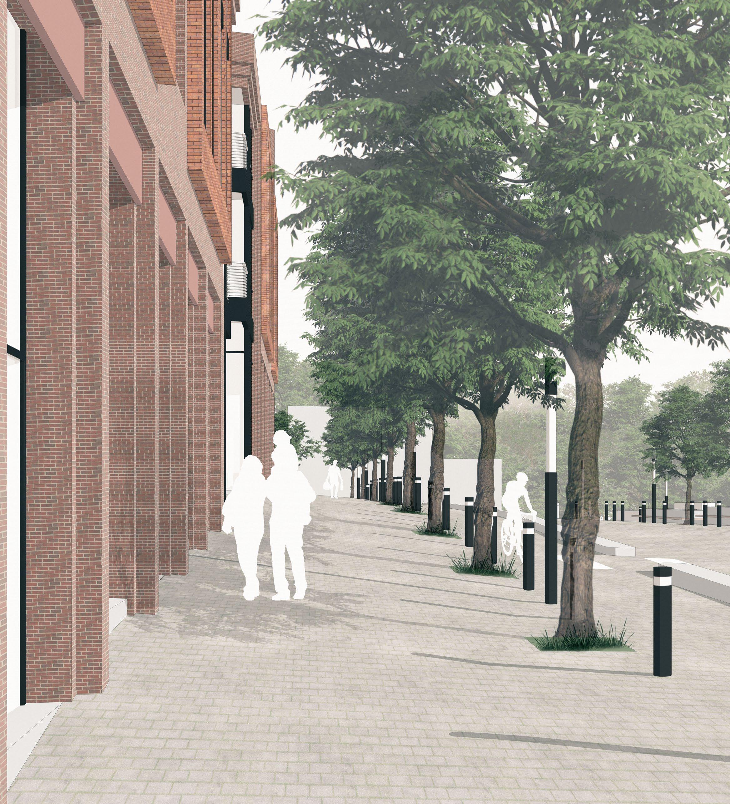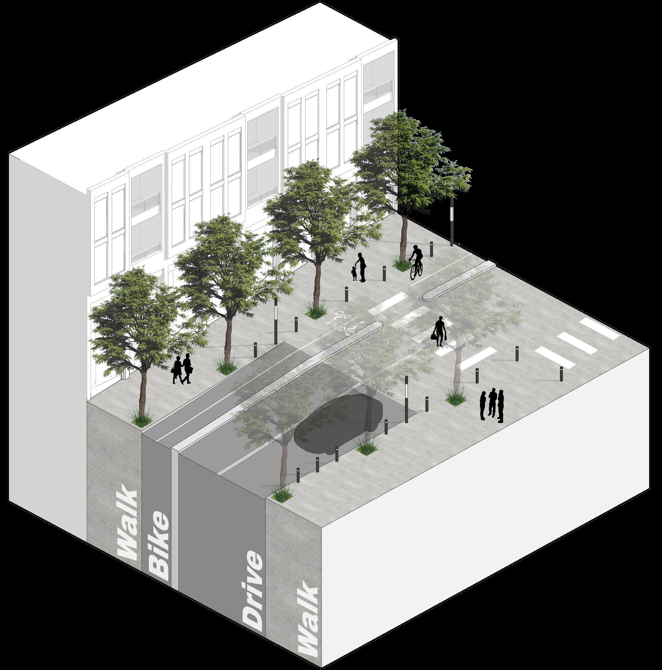 In order to improve connectivity, we looked to the street conditions and methods of transportation. We improved the sidewalk conditions and tree coverage while making the street more narrow to reduce car speeds. We also provided a protected bike path and a hyperlocal transportation hub to promote sustainable local connectivity.