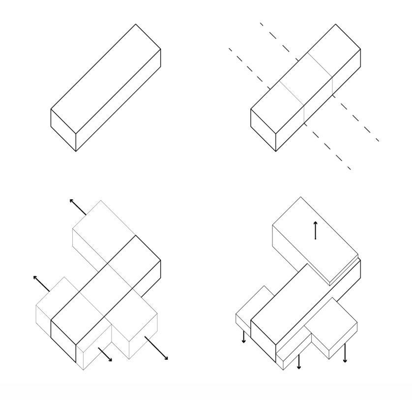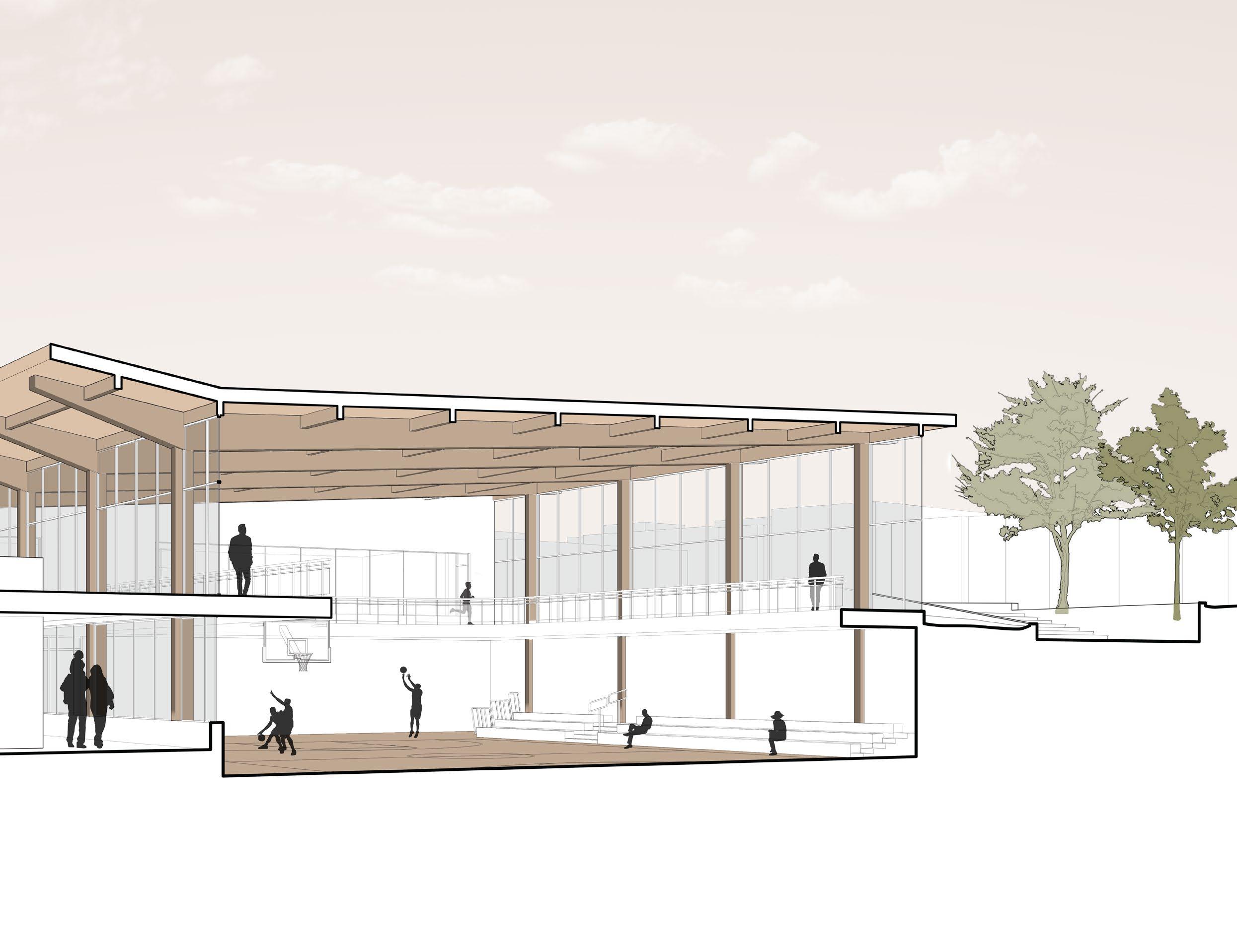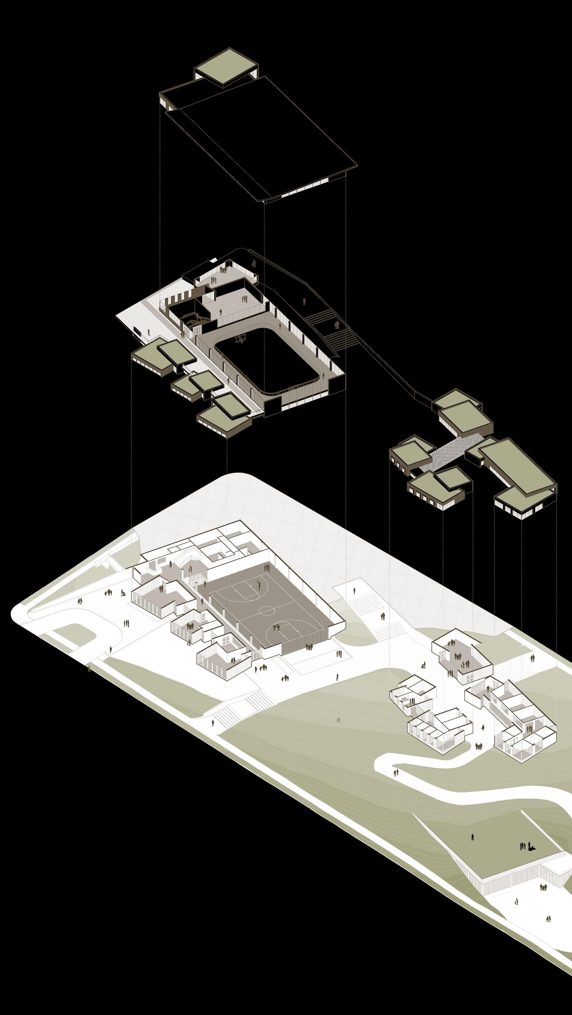 The design began with a primary axis aligned against the site’s topography, guiding the spatial organization. The massing was then divided into key spaces—physical, cognitive, and mental. Strategic separations, such as between the counseling center and basketball court, ensure each space supports its intended function while maintaining thoughtful connectivity across the program.