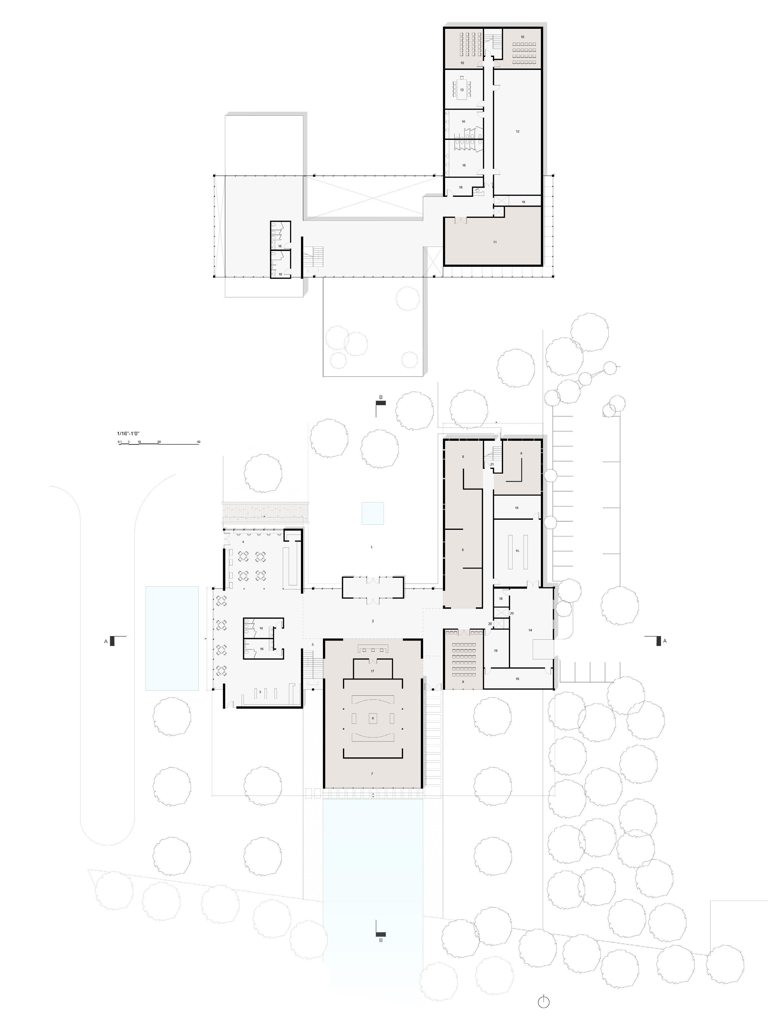 This longitudinal section illustrates the site from top to bottom, highlighting the elevation change between the gym and pool.