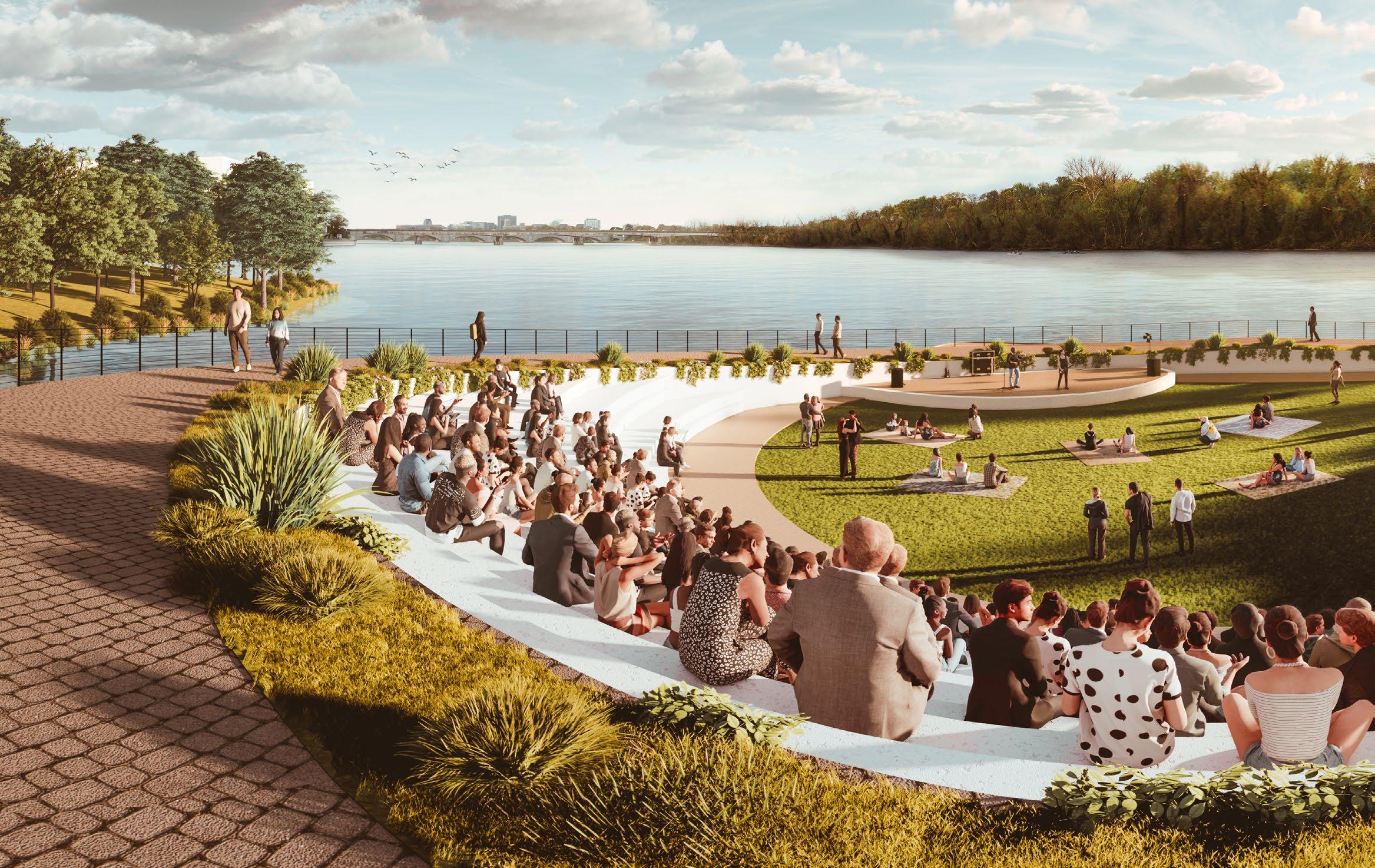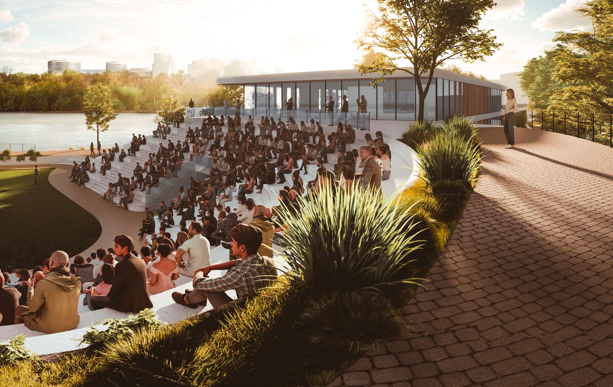 The render showcases the open-air amphitheater, with a stage elegantly framed by the Potomac River and a lush treeline backdrop.
