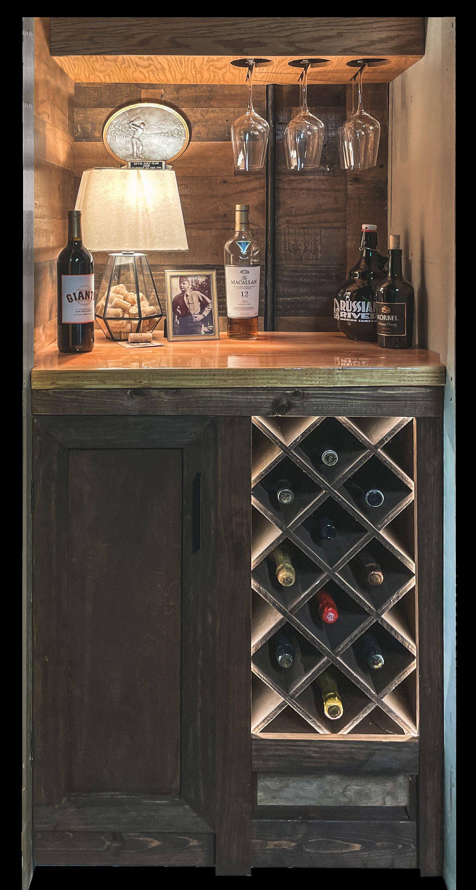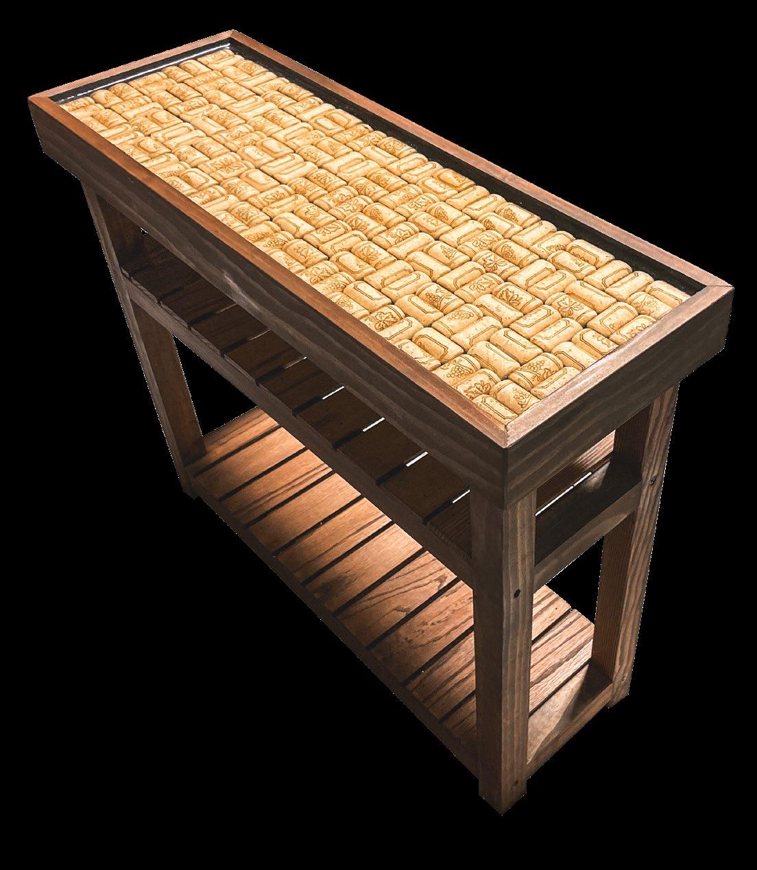 This is a roughly 1 foot by 3 foot table top built as a set of end tables. It is constructed from plywood, 2”x2” lumber, and thinner trim pieces to create the shelves and framing. The corks were then set into the tabletop using clear epoxy resin, creating a clear, waterproof, hard surface.