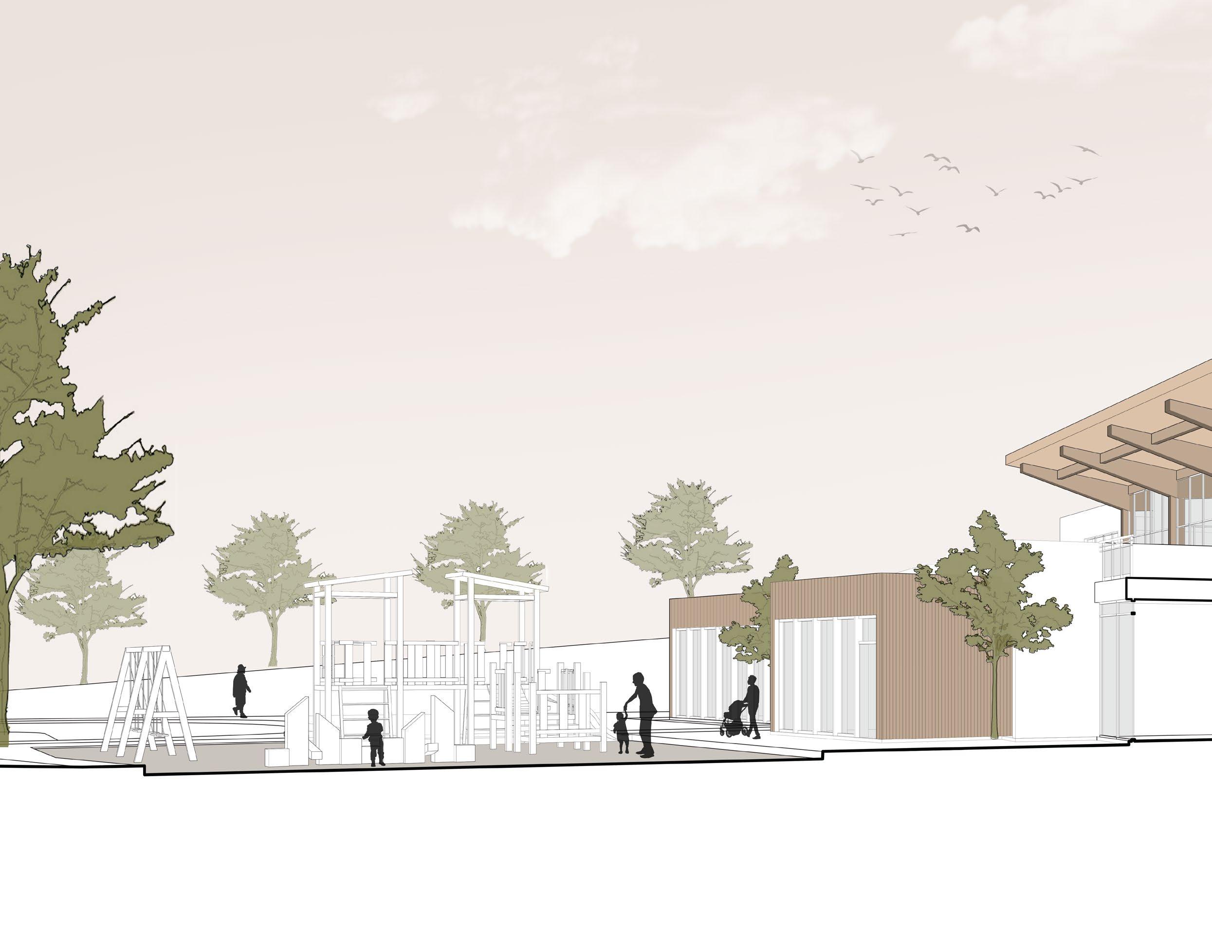 The design separates program elements into distinct buildings, creating a village-like layout that promotes movement and engagement. This approach forms a sheltered central courtyard, protected from 19th Avenue’s traffic and oriented toward the Pacific Ocean. The resulting space offers a calm, inviting environment that enhances both user experience and the overall functionality of the facility.