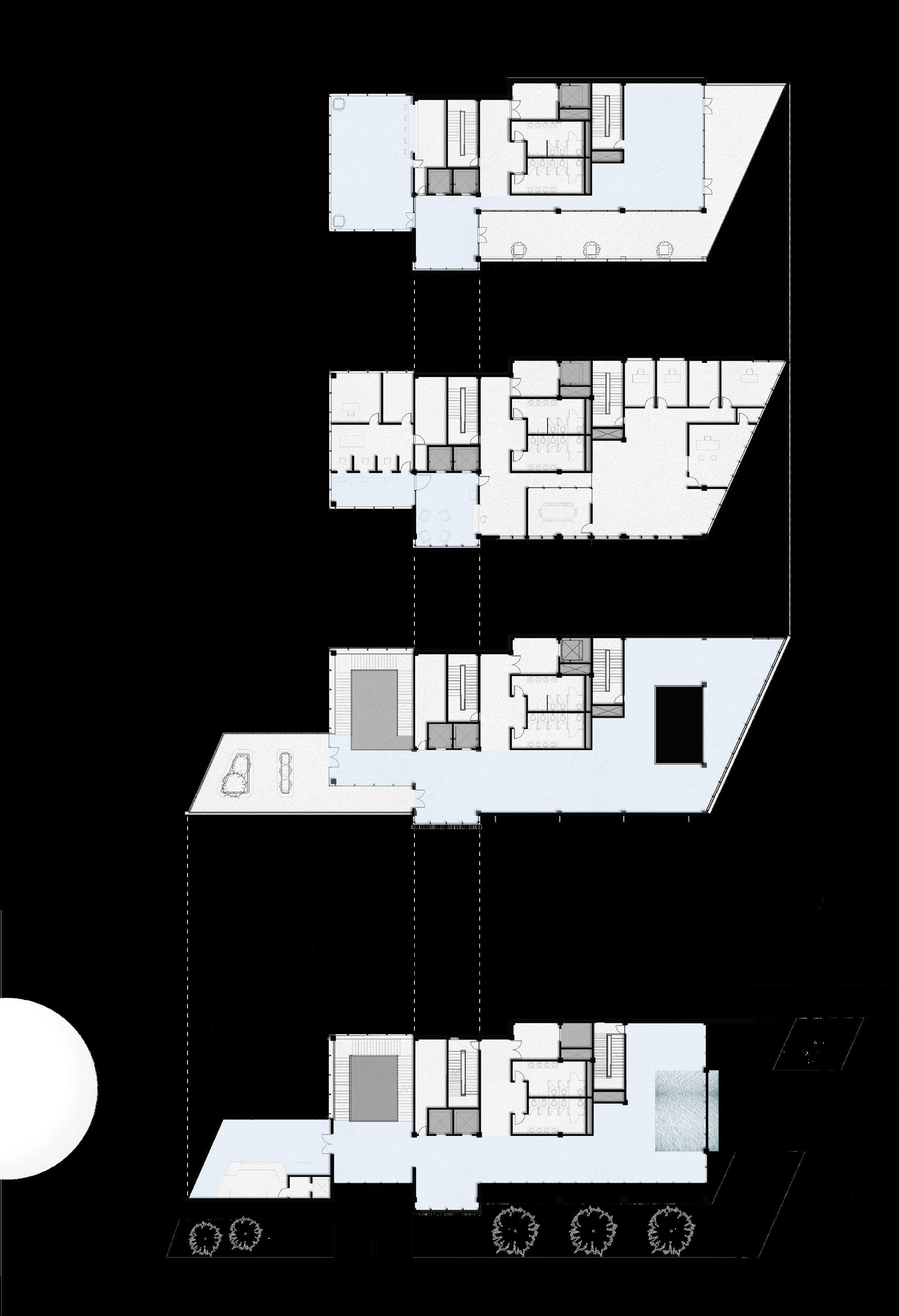 This project called for the design of an embassy from the country of our choosing. The site is located just NorthWest of Dupont Circle, and immediately adjacent to the North entrance of the Dupont Metro. As it stands, our site is home to the Dupont Circle Farmers Market, along with the 20th Streetery and outdoor restaurant seating. All of this, makes our site an ideal spot for public engagement. This led us to one of our main goals of enhancing public space, improving the existing greenscape, and embodying the dichotomies of Iceland. After meeting with the Ambassador, we began to understand that Iceland presents itself as a land between two vast worlds, and their goal is to create a connection between the two. With this in mind, we utilized the ground floor and rooftop as an extension of the existing public space, and as a result, our diplomatic offices were intertwined with the public space around them.