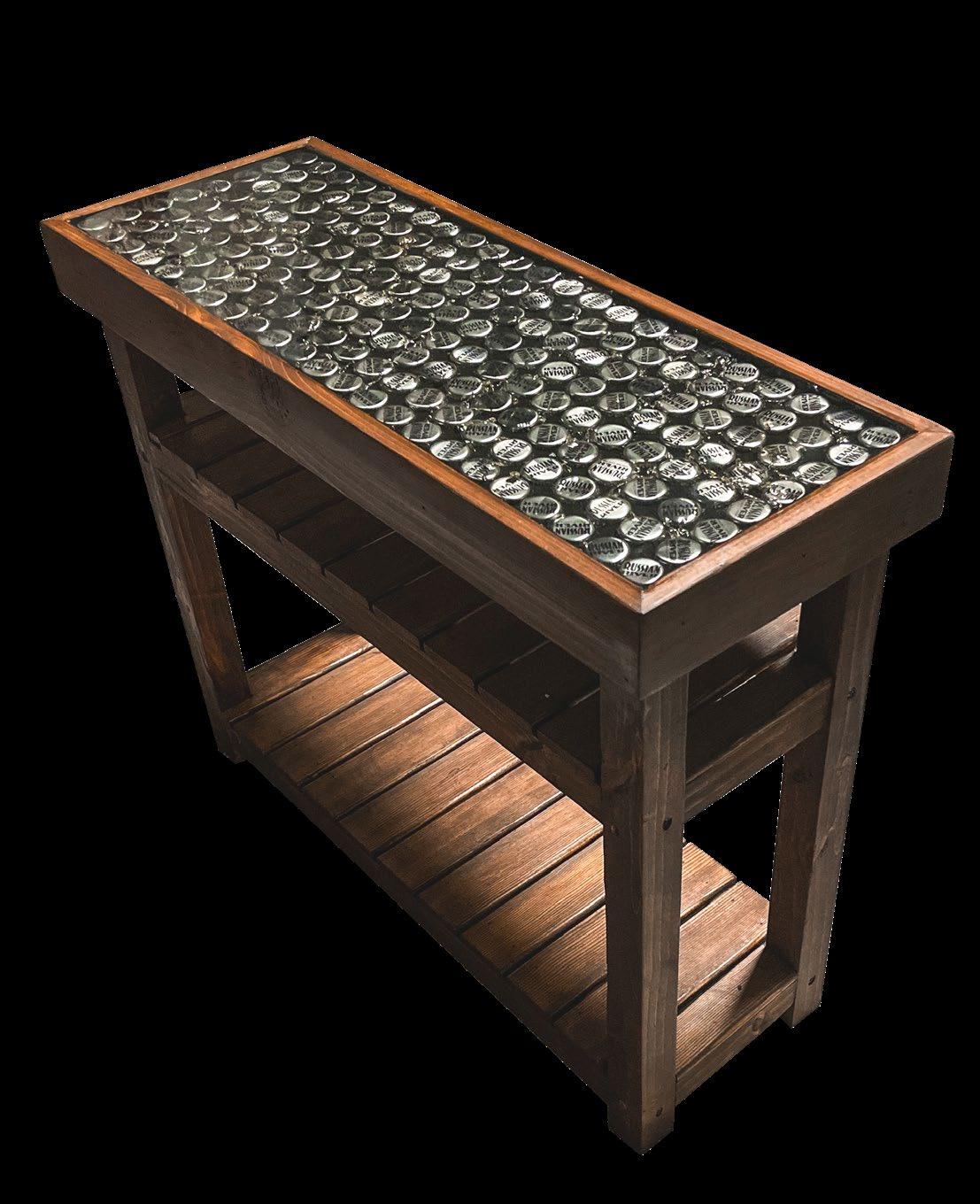 This table was the counterpart to the cork side table. With the same dimensions and construction method the project differs only in the display on the top itself. In this table, I used old bottle caps and again coated them in a layer of clear epoxy. Both pieces were stained in a dark walnut color and serve as end pieces on either side of a couch.