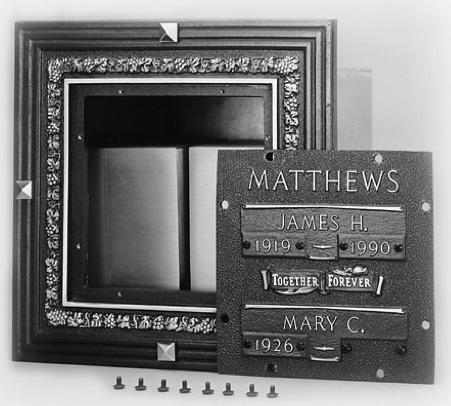 A wide array of bronze crypt and niche plates can be selected to complement any mausoleum or columbarium front. See pages 44-51.