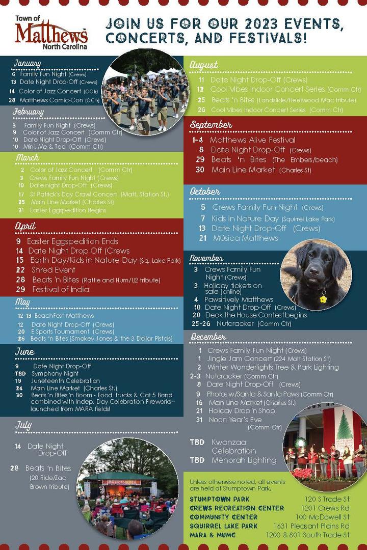 T O W N O F M A T T H E W S P A R K S , R E C R E A T I O N & C U L T U R A L R E S O U R C E D E P A R T M E N T PARKS & SPECIAL EVENTS For more information about Parks, call 704-708-1288 For more information about Special Events, call 704-708-1261 Joinusforour2023events, concerts,andfestivals!