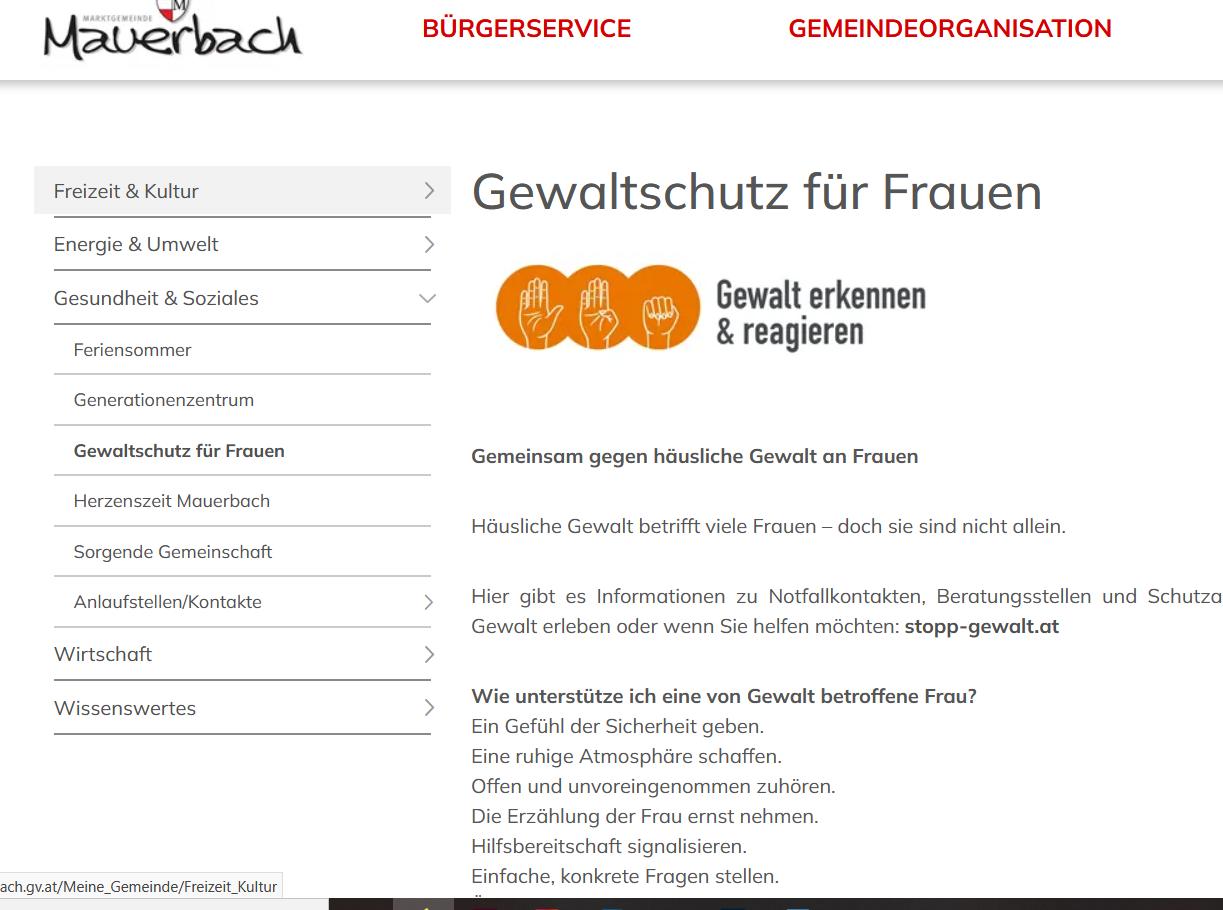 Seit Jahren erweitert die Gemeinde Mauerbach ihre Unterstützung zum Thema Gewaltschutz für Frauen. Seit kurzem sind auch alle wichtigen Anlaufstellen für Kontaktmöglichkeiten auf der Gemeindehomepage abrufbar.
