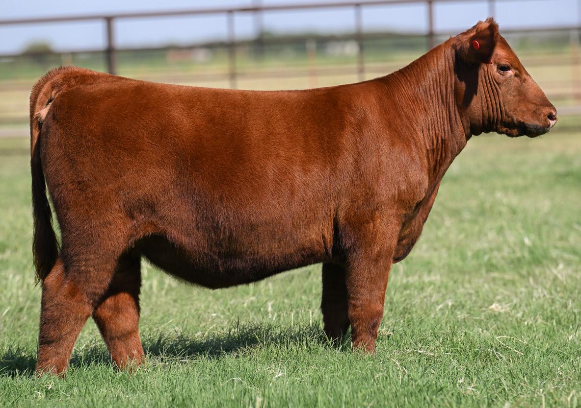 • Combining genetic value with visual performance, this daughter of RED DIAMOND EL REY 102, who was named Supreme Champion at the 2023 Cattlemen’s Congress and National Champion Red Angus Bull after first being named Champion Red Angus Bull at the 2022 NWSS and the 2022 FWSS, is a true sale highlight. Her body type and volume suggest function and profitability, as she offers width, volume and stoutness. In addition to this, she is a flexible made heifer that provides an attractive look from the side.