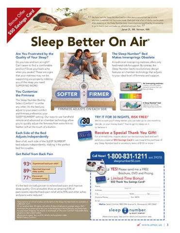 It’s the bed clinically proven to relieve back pain and improve sleep quality. Clinical studies show an amazing 93% of participants reported back-pain relief while 90% said other aches and pains were reduced.* *Descriptions of clinical studies conducted on the Sleep Number bed are available at 1-800-831-1211. †If not satisfied after 30 nights, call within 45 days of delivery to arrange return. We’ll reimburse the purchase price less your initial shipping or Home Delivery and Setup fees. You pay return shipping. No returns or exchanges on Precision Comfort® Adjustable Base, closeout or demo bed models. ‡Restrictions apply. See card for details and expiration date. ©2009 Select Comfort