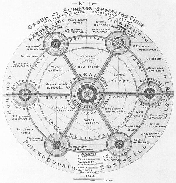 El movimiento de las ciudades jardín fue fundado por Sir Ebenezer Howard (1850-1928). La ciudad-jardín está organizada siguiendo un esquema circular, con seis avenidas radiales que dividen la superficie urbana en seis sectores, mientras que en el centro de la ciudad se extiende un parque de 2,25 hectáreas, alrededor del cual están dispuestos los edificios públicos: ayuntamiento, auditorio, teatro, biblioteca, museo, pinacoteca, hospital. El sistema de la ciudad-jardín se distribuye alrededor de la ciudad central formando un anillo de treinta y dos kilómetros de circunferencia, con una distancia de 5,25 kilómetros entre cada ciudad y la ciudad central.